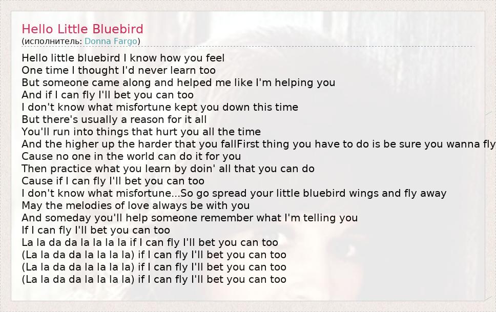 Hello little bluebird I know how you feel One time I thought I'd never learn too But someone came along and helped me like I'm helping you And if I can fly I'll bet you can too I don't know what misfortune kept you down this time But there's usually a reason for it all You'll run into things that hurt you all the time And the higher up the harder that you fallFirst thing you have to do is be sure you wanna fly Cause no one in the world can do it for you Then practice what you learn by doin' all that you can do Cause if I can fly I'll bet you can too I don't know what misfortune...So go spread your little bluebird wings and fly away May the melodies of love always be with you And someday you'll help someone remember what I'm telling you If I can fly I'll bet you can too La la da da la la la la if I can fly I'll bet you can too (La la da da la la la la) if I can fly I'll bet you can too (La la da da la la la la) if I can fly I'll bet you can too (La la da da la la la la) if I can fly I'll bet you can too