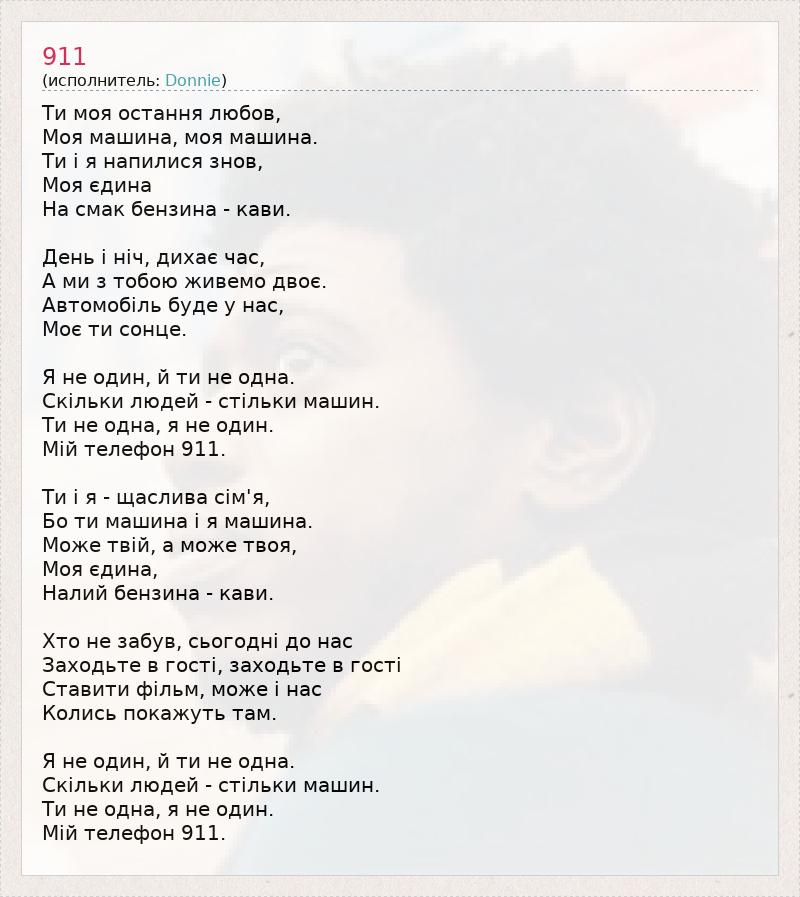 Ти моя остання любов, Моя машина, моя машина. Ти i я напилися знов, Моя єдина На смак бензина - кави. День i ніч, дихає час, А ми з тобою живемо двоє. Автомобiль буде у нас, Моє ти сонце. Я не один, й ти не одна. Скiльки людей - стiльки машин. Ти не одна, я не один. Мiй телефон 911. Ти i я - щаслива сiм'я, Бо ти машина i я машина. Може твiй, а може твоя, Моя єдина, Налий бензина - кави. Хто не забув, сьогоднi до нас Заходьте в гостi, заходьте в гостi Ставити фiльм, може i нас Колись покажуть там. Я не один, й ти не одна. Скiльки людей - стiльки машин. Ти не одна, я не один. Мiй телефон 911.