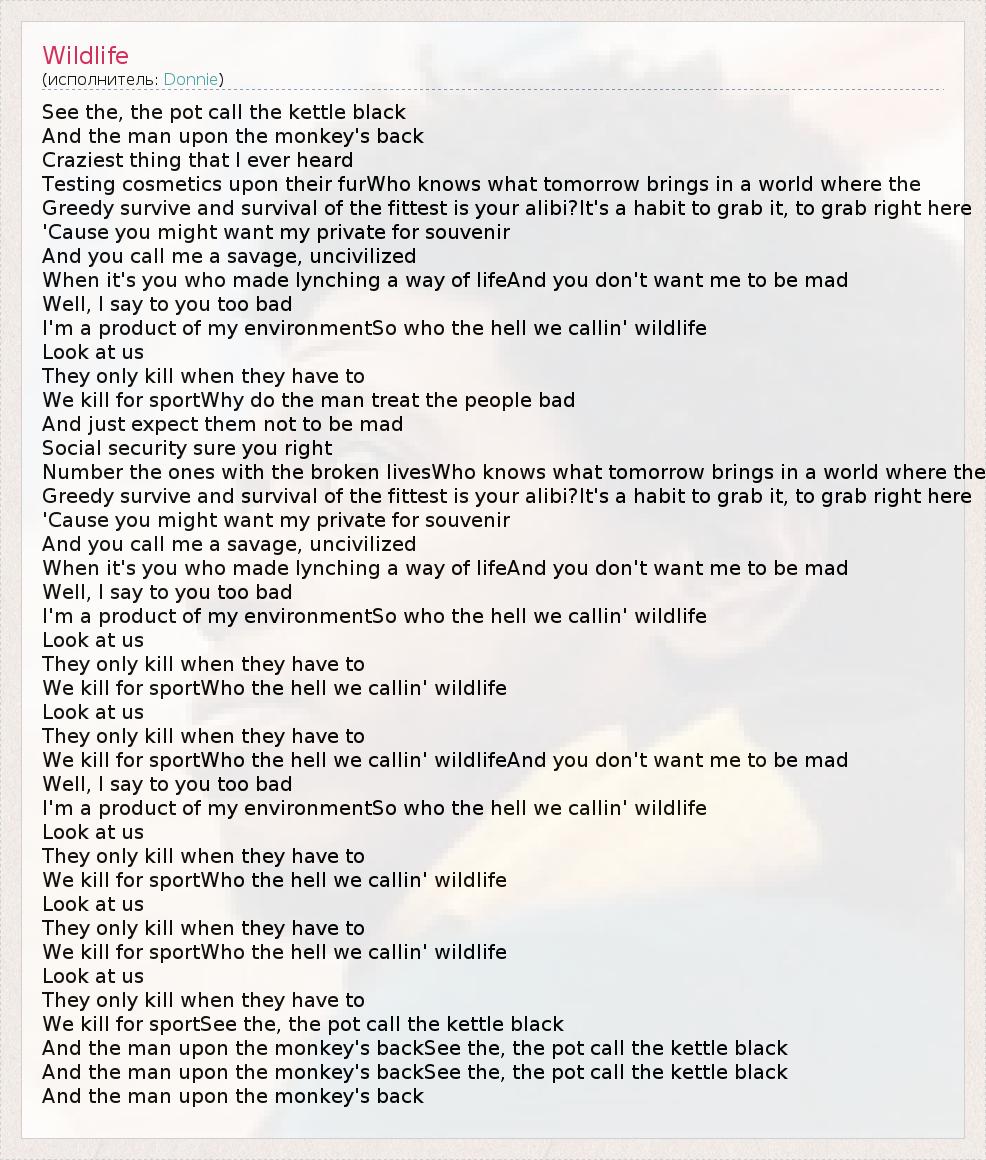 See the, the pot call the kettle black And the man upon the monkey's back Craziest thing that I ever heard Testing cosmetics upon their furWho knows what tomorrow brings in a world where the Greedy survive and survival of the fittest is your alibi?It's a habit to grab it, to grab right here 'Cause you might want my private for souvenir And you call me a savage, uncivilized When it's you who made lynching a way of lifeAnd you don't want me to be mad Well, I say to you too bad I'm a product of my environmentSo who the hell we callin' wildlife Look at us They only kill when they have to We kill for sportWhy do the man treat the people bad And just expect them not to be mad Social security sure you right Number the ones with the broken livesWho knows what tomorrow brings in a world where the Greedy survive and survival of the fittest is your alibi?It's a habit to grab it, to grab right here 'Cause you might want my private for souvenir And you call me a savage, uncivilized When it's you who made lynching a way of lifeAnd you don't want me to be mad Well, I say to you too bad I'm a product of my environmentSo who the hell we callin' wildlife Look at us They only kill when they have to We kill for sportWho the hell we callin' wildlife Look at us They only kill when they have to We kill for sportWho the hell we callin' wildlifeAnd you don't want me to be mad Well, I say to you too bad I'm a product of my environmentSo who the hell we callin' wildlife Look at us They only kill when they have to We kill for sportWho the hell we callin' wildlife Look at us They only kill when they have to We kill for sportWho the hell we callin' wildlife Look at us They only kill when they have to We kill for sportSee the, the pot call the kettle black And the man upon the monkey's backSee the, the pot call the kettle black And the man upon the monkey's backSee the, the pot call the kettle black And the man upon the monkey's back