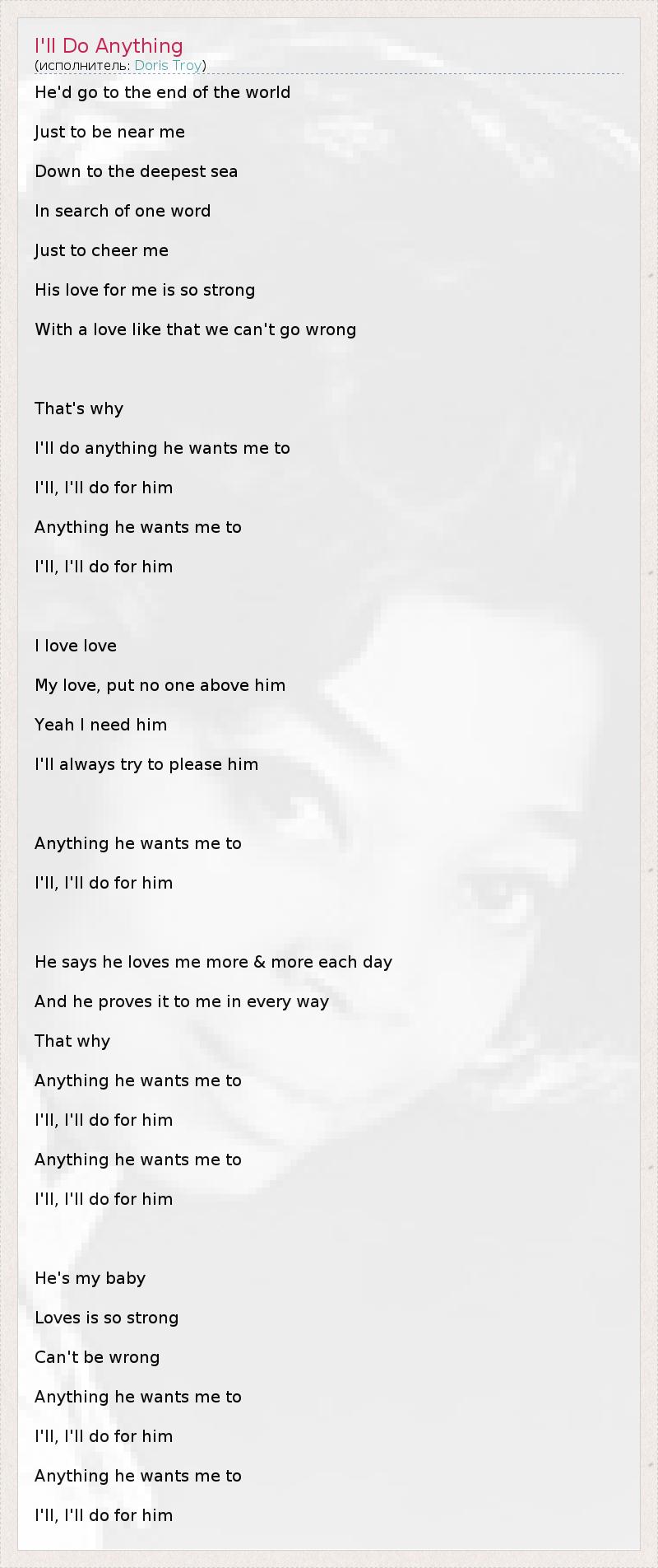 He'd go to the end of the world Just to be near me Down to the deepest sea In search of one word Just to cheer me His love for me is so strong With a love like that we can't go wrong That's why I'll do anything he wants me to I'll, I'll do for him Anything he wants me to I'll, I'll do for him I love love My love, put no one above him Yeah I need him I'll always try to please him Anything he wants me to I'll, I'll do for him He says he loves me more & more each day And he proves it to me in every way That why Anything he wants me to I'll, I'll do for him Anything he wants me to I'll, I'll do for him He's my baby Loves is so strong Can't be wrong Anything he wants me to I'll, I'll do for him Anything he wants me to I'll, I'll do for him
