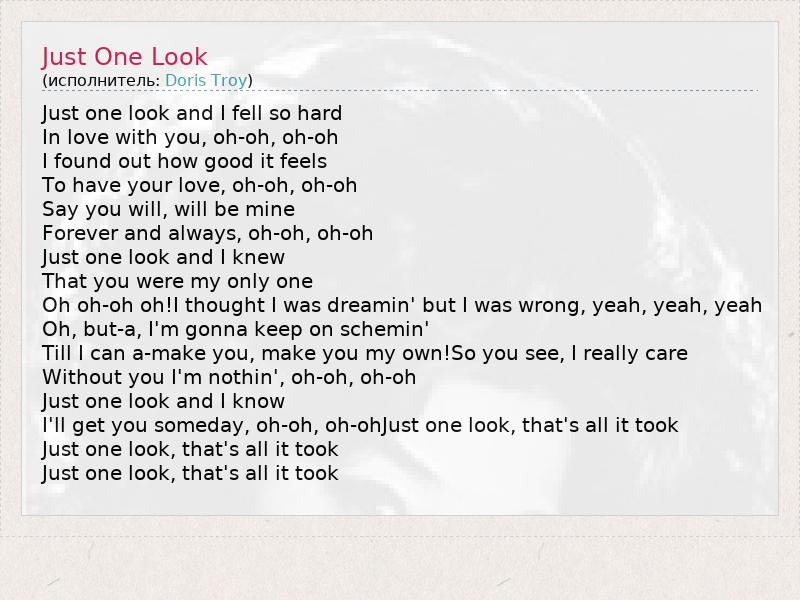 Just one look and I fell so hard In love with you, oh-oh, oh-oh I found out how good it feels To have your love, oh-oh, oh-oh Say you will, will be mine Forever and always, oh-oh, oh-oh Just one look and I knew That you were my only one Oh oh-oh oh!I thought I was dreamin' but I was wrong, yeah, yeah, yeah Oh, but-a, I'm gonna keep on schemin' Till I can a-make you, make you my own!So you see, I really care Without you I'm nothin', oh-oh, oh-oh Just one look and I know I'll get you someday, oh-oh, oh-ohJust one look, that's all it took Just one look, that's all it took Just one look, that's all it took