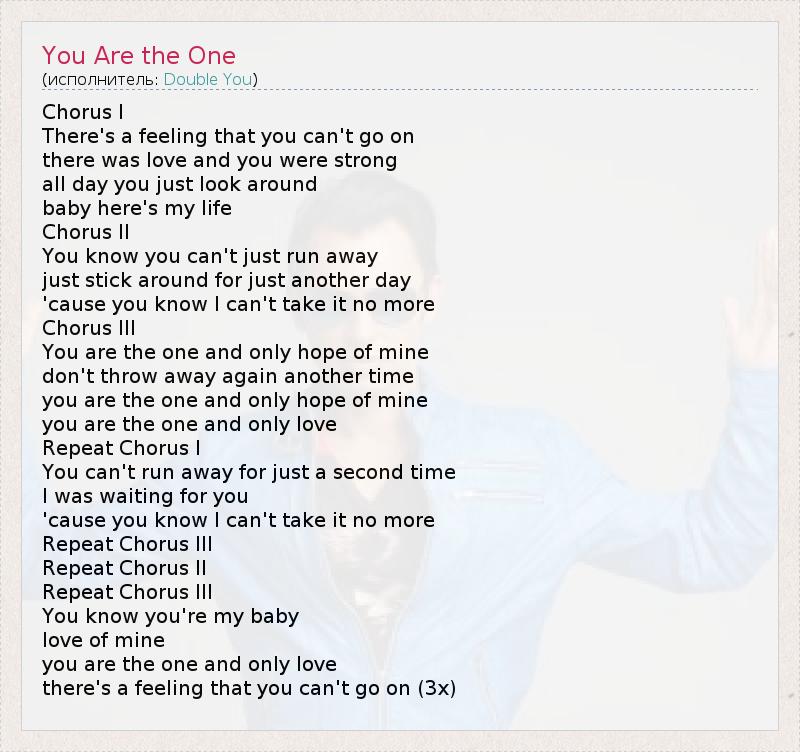 Chorus I There's a feeling that you can't go on there was love and you were strong all day you just look around baby here's my life Chorus II You know you can't just run away just stick around for just another day 'cause you know I can't take it no more Chorus III You are the one and only hope of mine don't throw away again another time you are the one and only hope of mine you are the one and only love Repeat Chorus I You can't run away for just a second time I was waiting for you 'cause you know I can't take it no more Repeat Chorus III Repeat Chorus II Repeat Chorus III You know you're my baby love of mine you are the one and only love there's a feeling that you can't go on (3x)