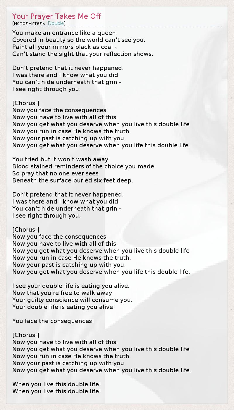 Ты входишь, как королева, Скрываешься в красоте, чтобы мир не мог тебя видеть. Закрашу все твои зеркала в чёрное, как уголь, Терпеть не могу то, что показывает твоё отражение. Не делай вид, будто этого не происходит, Я был там и знаю, что ты делала. Ты не сможешь скрыться за улыбкой, Я вижу тебя насквозь. [Припев:] Теперь ты сталкиваешься с последствиями. Теперь тебе придется жить со всем этим. Теперь ты получаешь то, что заслуживаешь, живя двойной жизнью. Теперь ты бежишь на случай, если Он узнаёт правду. Теперь твоё прошлое догоняет тебя. Теперь ты получаешь то, что заслуживаешь, живя двойной жизнью. Ты пытался оттереть, но они не смываются, Пятна крови напоминают о твоём выборе. Так что помолись, пока никто не видит, Заройся под землю на шесть футов глубиной. Не делай вид, будто этого не происходит, Я был там и знаю, что ты делала. Ты не сможешь скрыться за улыбкой, Я вижу тебя насквозь. [Припев:] Теперь ты сталкиваешься с последствиями. Теперь тебе придется жить со всем этим. Теперь ты получаешь то, что заслуживаешь, живя двойной жизнью. Теперь ты бежишь на случай, если Он узнаёт правду. Теперь твоё прошлое догоняет тебя. Теперь ты получаешь то, что заслуживаешь, живя двойной жизнью. Я вижу, как двойная жизнь съедает тебя живьём. Теперь, когда ты можешь спокойно уйти, Твоя совесть будет мучить тебя. Двойная жизнь съедает тебя живьём! Ты сталкиваешься с последствиями! [Припев:] Теперь тебе придется жить со всем этим. Теперь ты получаешь то, что заслуживаешь, живя двойной жизнью. Теперь ты бежишь на случай, если Он узнаёт правду. Теперь твоё прошлое догоняет тебя. Теперь ты получаешь то, что заслуживаешь, живя двойной жизнью. Живя двойной жизнью! Живя двойной жизнью!