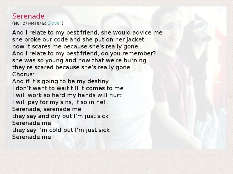 And I relate to my best friend, she would advice me she broke our code and she put on her jacket now it scares me because she's really gone. And I relate to my best friend, do you remember? she was so young and now that we're burning they're scared because she's really gone. Chorus: And if it's going to be my destiny I don't want to wait till it comes to me I will work so hard my hands will hurt I will pay for my sins, if so in hell. Serenade, serenade me they say and dry but I'm just sick Serenade me they say I'm cold but I'm just sick Serenade me
