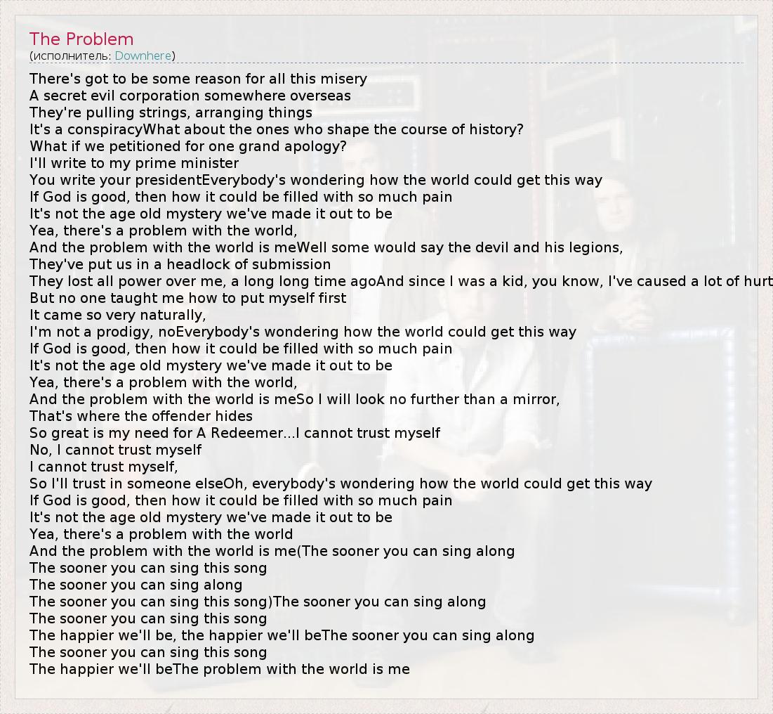 There's got to be some reason for all this misery A secret evil corporation somewhere overseas They're pulling strings, arranging things It's a conspiracyWhat about the ones who shape the course of history? What if we petitioned for one grand apology? I'll write to my prime minister You write your presidentEverybody's wondering how the world could get this way If God is good, then how it could be filled with so much pain It's not the age old mystery we've made it out to be Yea, there's a problem with the world, And the problem with the world is meWell some would say the devil and his legions, They've put us in a headlock of submission They lost all power over me, a long long time agoAnd since I was a kid, you know, I've caused a lot of hurt But no one taught me how to put myself first It came so very naturally, I'm not a prodigy, noEverybody's wondering how the world could get this way If God is good, then how it could be filled with so much pain It's not the age old mystery we've made it out to be Yea, there's a problem with the world, And the problem with the world is meSo I will look no further than a mirror, That's where the offender hides So great is my need for A Redeemer...I cannot trust myself No, I cannot trust myself I cannot trust myself, So I'll trust in someone elseOh, everybody's wondering how the world could get this way If God is good, then how it could be filled with so much pain It's not the age old mystery we've made it out to be Yea, there's a problem with the world And the problem with the world is me(The sooner you can sing along The sooner you can sing this song The sooner you can sing along The sooner you can sing this song)The sooner you can sing along The sooner you can sing this song The happier we'll be, the happier we'll beThe sooner you can sing along The sooner you can sing this song The happier we'll beThe problem with the world is me