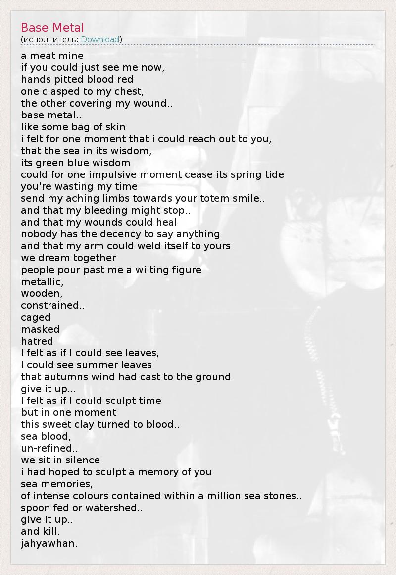 a meat mine if you could just see me now, hands pitted blood red one clasped to my chest, the other covering my wound.. base metal.. like some bag of skin i felt for one moment that i could reach out to you, that the sea in its wisdom, its green blue wisdom could for one impulsive moment cease its spring tide you're wasting my time send my aching limbs towards your totem smile.. and that my bleeding might stop.. and that my wounds could heal nobody has the decency to say anything and that my arm could weld itself to yours we dream together people pour past me a wilting figure metallic, wooden, constrained.. caged masked hatred I felt as if I could see leaves, I could see summer leaves that autumns wind had cast to the ground give it up... I felt as if I could sculpt time but in one moment this sweet clay turned to blood.. sea blood, un-refined.. we sit in silence i had hoped to sculpt a memory of you sea memories, of intense colours contained within a million sea stones.. spoon fed or watershed.. give it up.. and kill. jahyawhan.