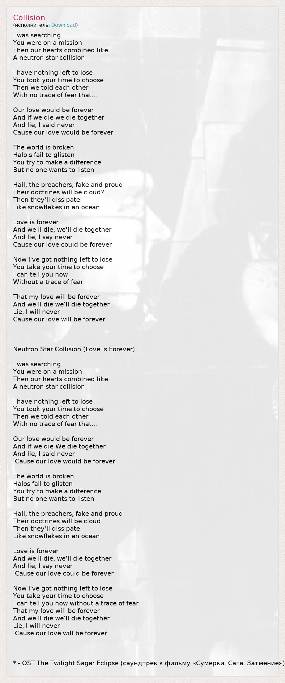 I was searching You were on a mission Then our hearts combined like A neutron star collision I have nothing left to lose You took your time to choose Then we told each other With no trace of fear that... Our love would be forever And if we die we die together And lie, I said never Cause our love would be forever The world is broken Halo's fail to glisten You try to make a difference But no one wants to listen Hail, the preachers, fake and proud Their doctrines will be cloud? Then they'll dissipate Like snowflakes in an ocean Love is forever And we'll die, we'll die together And lie, I say never Cause our love could be forever Now I've got nothing left to lose You take your time to choose I can tell you now Without a trace of fear That my love will be forever And we'll die we'll die together Lie, I will never Cause our love will be forever Neutron Star Collision (Love Is Forever) I was searching You were on a mission Then our hearts combined like A neutron star collision I have nothing left to lose You took your time to choose Then we told each other With no trace of fear that... Our love would be forever And if we die We die together And lie, I said never 'Cause our love would be forever The world is broken Halos fail to glisten You try to make a difference But no one wants to listen Hail, the preachers, fake and proud Their doctrines will be cloud Then they'll dissipate Like snowflakes in an ocean Love is forever And we'll die, we'll die together And lie, I say never 'Cause our love could be forever Now I've got nothing left to lose You take your time to choose I can tell you now without a trace of fear That my love will be forever And we'll die we'll die together Lie, I will never 'Cause our love will be forever * - OST The Twilight Saga: Eclipse (саундтрек к фильму «Сумерки. Сага. Затмение»)