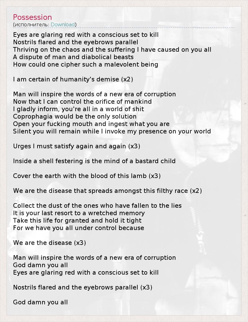 Eyes are glaring red with a conscious set to kill Nostrils flared and the eyebrows parallel Thriving on the chaos and the suffering I have caused on you all A dispute of man and diabolical beasts How could one cipher such a malevolent being I am certain of humanity's demise (x2) Man will inspire the words of a new era of corruption Now that I can control the orifice of mankind I gladly inform, you're all in a world of shit Coprophagia would be the only solution Open your fucking mouth and ingest what you are Silent you will remain while I invoke my presence on your world Urges I must satisfy again and again (x3) Inside a shell festering is the mind of a bastard child Cover the earth with the blood of this lamb (x3) We are the disease that spreads amongst this filthy race (x2) Collect the dust of the ones who have fallen to the lies It is your last resort to a wretched memory Take this life for granted and hold it tight For we have you all under control because We are the disease (x3) Man will inspire the words of a new era of corruption God damn you all Eyes are glaring red with a conscious set to kill Nostrils flared and the eyebrows parallel (x3) God damn you all