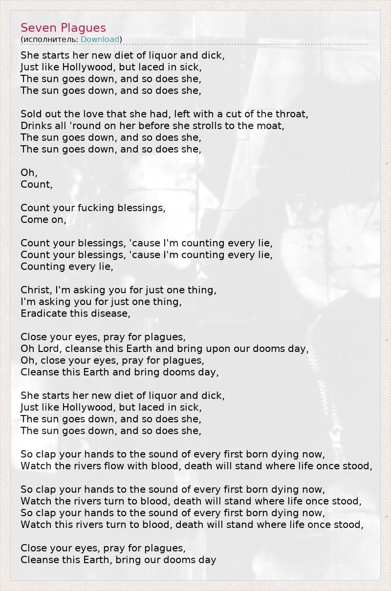 She starts her new diet of liquor and dick, Just like Hollywood, but laced in sick, The sun goes down, and so does she, The sun goes down, and so does she, Sold out the love that she had, left with a cut of the throat, Drinks all 'round on her before she strolls to the moat, The sun goes down, and so does she, The sun goes down, and so does she, Oh, Count, Count your fucking blessings, Come on, Count your blessings, 'cause I'm counting every lie, Count your blessings, 'cause I'm counting every lie, Counting every lie, Christ, I'm asking you for just one thing, I'm asking you for just one thing, Eradicate this disease, Close your eyes, pray for plagues, Oh Lord, cleanse this Earth and bring upon our dooms day, Oh, close your eyes, pray for plagues, Cleanse this Earth and bring dooms day, She starts her new diet of liquor and dick, Just like Hollywood, but laced in sick, The sun goes down, and so does she, The sun goes down, and so does she, So clap your hands to the sound of every first born dying now, Watch the rivers flow with blood, death will stand where life once stood, So clap your hands to the sound of every first born dying now, Watch the rivers turn to blood, death will stand where life once stood, So clap your hands to the sound of every first born dying now, Watch this rivers turn to blood, death will stand where life once stood, Close your eyes, pray for plagues, Cleanse this Earth, bring our dooms day