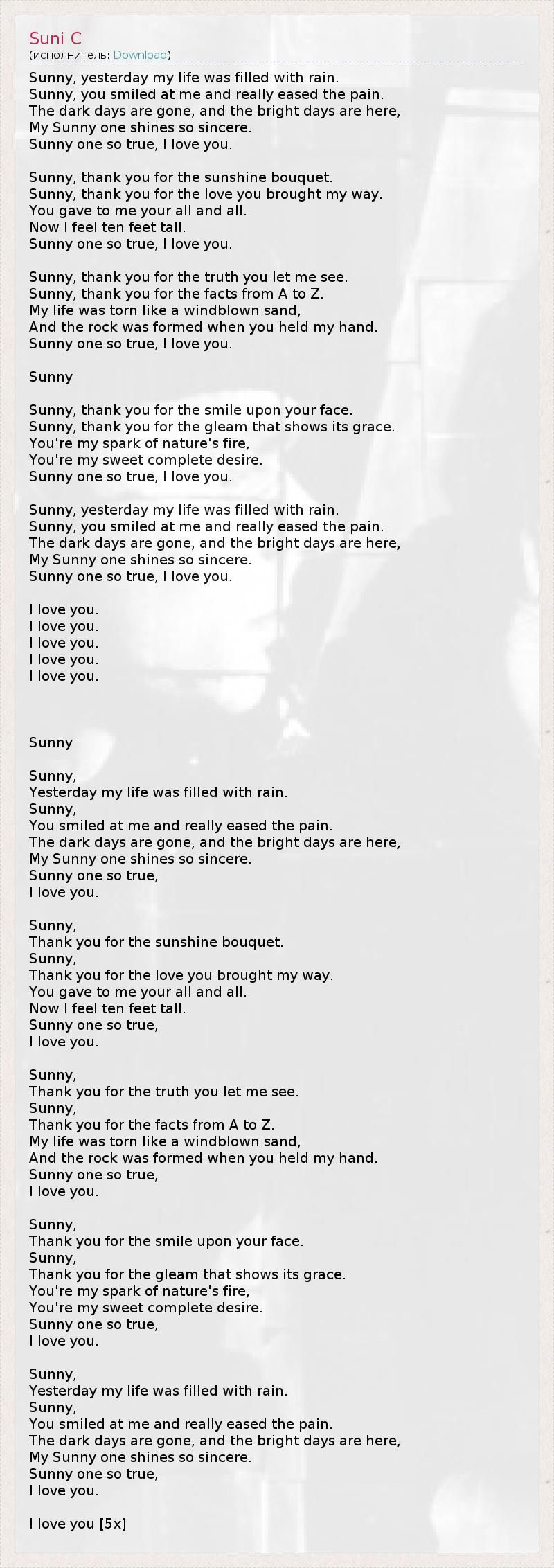 Sunny, yesterday my life was filled with rain. Sunny, you smiled at me and really eased the pain. The dark days are gone, and the bright days are here, My Sunny one shines so sincere. Sunny one so true, I love you. Sunny, thank you for the sunshine bouquet. Sunny, thank you for the love you brought my way. You gave to me your all and all. Now I feel ten feet tall. Sunny one so true, I love you. Sunny, thank you for the truth you let me see. Sunny, thank you for the facts from A to Z. My life was torn like a windblown sand, And the rock was formed when you held my hand. Sunny one so true, I love you. Sunny Sunny, thank you for the smile upon your face. Sunny, thank you for the gleam that shows its grace. You're my spark of nature's fire, You're my sweet complete desire. Sunny one so true, I love you. Sunny, yesterday my life was filled with rain. Sunny, you smiled at me and really eased the pain. The dark days are gone, and the bright days are here, My Sunny one shines so sincere. Sunny one so true, I love you. I love you. I love you. I love you. I love you. I love you. Sunny Sunny, Yesterday my life was filled with rain. Sunny, You smiled at me and really eased the pain. The dark days are gone, and the bright days are here, My Sunny one shines so sincere. Sunny one so true, I love you. Sunny, Thank you for the sunshine bouquet. Sunny, Thank you for the love you brought my way. You gave to me your all and all. Now I feel ten feet tall. Sunny one so true, I love you. Sunny, Thank you for the truth you let me see. Sunny, Thank you for the facts from A to Z. My life was torn like a windblown sand, And the rock was formed when you held my hand. Sunny one so true, I love you. Sunny, Thank you for the smile upon your face. Sunny, Thank you for the gleam that shows its grace. You're my spark of nature's fire, You're my sweet complete desire. Sunny one so true, I love you. Sunny, Yesterday my life was filled with rain. Sunny, You smiled at me and really eased the pain. The dark days are gone, and the bright days are here, My Sunny one shines so sincere. Sunny one so true, I love you. I love you [5x]