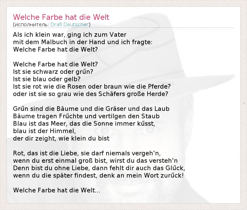Als ich klein war, ging ich zum Vater mit dem Malbuch in der Hand und ich fragte: Welche Farbe hat die Welt? Welche Farbe hat die Welt? Ist sie schwarz oder grűn? Ist sie blau oder gelb? Ist sie rot wie die Rosen oder braun wie die Pferde? oder ist sie so grau wie des Schäfers große Herde? Grűn sind die Bäume und die Gräser und das Laub Bäume tragen Frűchte und vertilgen den Staub Blau ist das Meer, das die Sonne immer kűsst, blau ist der Himmel, der dir zeight, wie klein du bist Rot, das ist die Liebe, sie darf niemals vergeh'n, wenn du erst einmal groß bist, wirst du das versteh'n Denn bist du ohne Liebe, dann fehlt dir auch das Glűck, wenn du die später findest, denk an mein Wort zurűck! Welche Farbe hat die Welt...