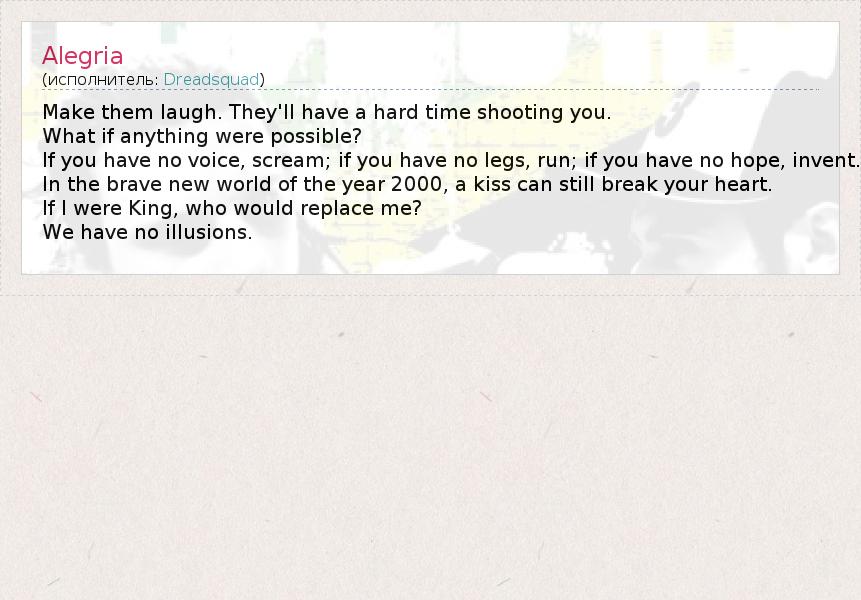 Это интересно:Dillinger (настоящее имя Lester Bullocks, родился 25 января 1953) - выдающийся рэгги артист. Диллинжер был частью второй волны диджеев-тостеров (начитывающих текст под свой ритм), которые распространились по Ямайке в середине 70х. Получивший вдохновление от Big Youth, U Roy и Dennis Alcapone, Диллинжер был известен за свою находчивость, юморные строки и пошлое содержание ("краб в моих штанах").Ребенком, росшим... продолжение
