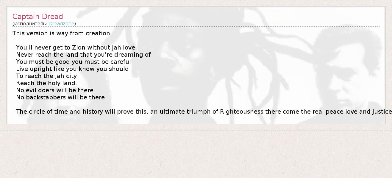 This version is way from creation You'll never get to Zion without Jah love Never reach the land that you're dreaming of You must be good you must be careful Live upright like you know you should To reach the Jah city Reach the holy land. No evil doers will be there No backstabbers will be there The circle of time and history will prove this: an ultimate triumph of Righteousness there come the real peace love and justice
