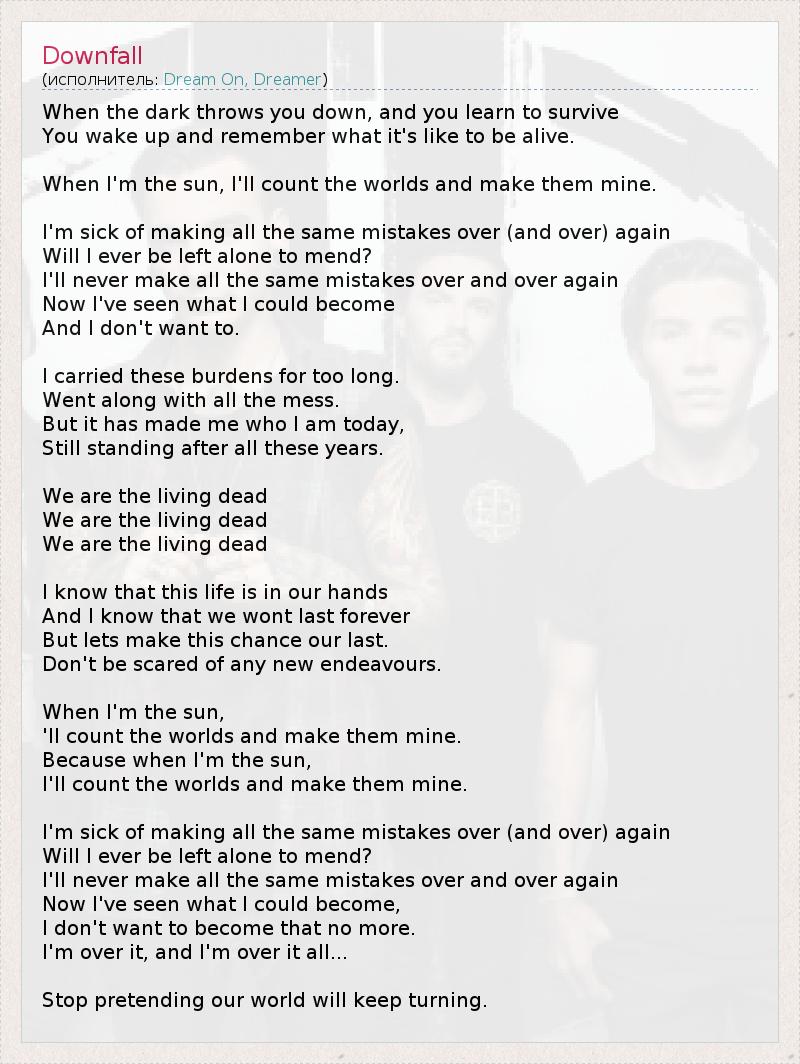When the dark throws you down, and you learn to survive You wake up and remember what it's like to be alive. When I'm the sun, I'll count the worlds and make them mine. I'm sick of making all the same mistakes over (and over) again Will I ever be left alone to mend? I'll never make all the same mistakes over and over again Now I've seen what I could become And I don't want to. I carried these burdens for too long. Went along with all the mess. But it has made me who I am today, Still standing after all these years. We are the living dead We are the living dead We are the living dead I know that this life is in our hands And I know that we wont last forever But lets make this chance our last. Don't be scared of any new endeavours. When I'm the sun, 'll count the worlds and make them mine. Because when I'm the sun, I'll count the worlds and make them mine. I'm sick of making all the same mistakes over (and over) again Will I ever be left alone to mend? I'll never make all the same mistakes over and over again Now I've seen what I could become, I don't want to become that no more. I'm over it, and I'm over it all... Stop pretending our world will keep turning.