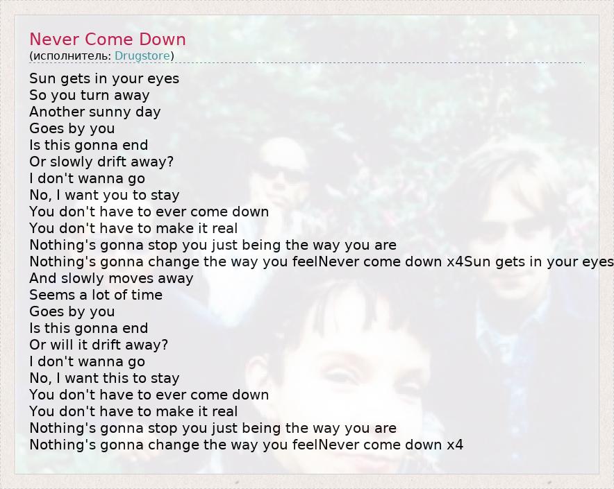 Sun gets in your eyes So you turn away Another sunny day Goes by you Is this gonna end Or slowly drift away? I don't wanna go No, I want you to stay You don't have to ever come down You don't have to make it real Nothing's gonna stop you just being the way you are Nothing's gonna change the way you feelNever come down x4Sun gets in your eyes And slowly moves away Seems a lot of time Goes by you Is this gonna end Or will it drift away? I don't wanna go No, I want this to stay You don't have to ever come down You don't have to make it real Nothing's gonna stop you just being the way you are Nothing's gonna change the way you feelNever come down x4