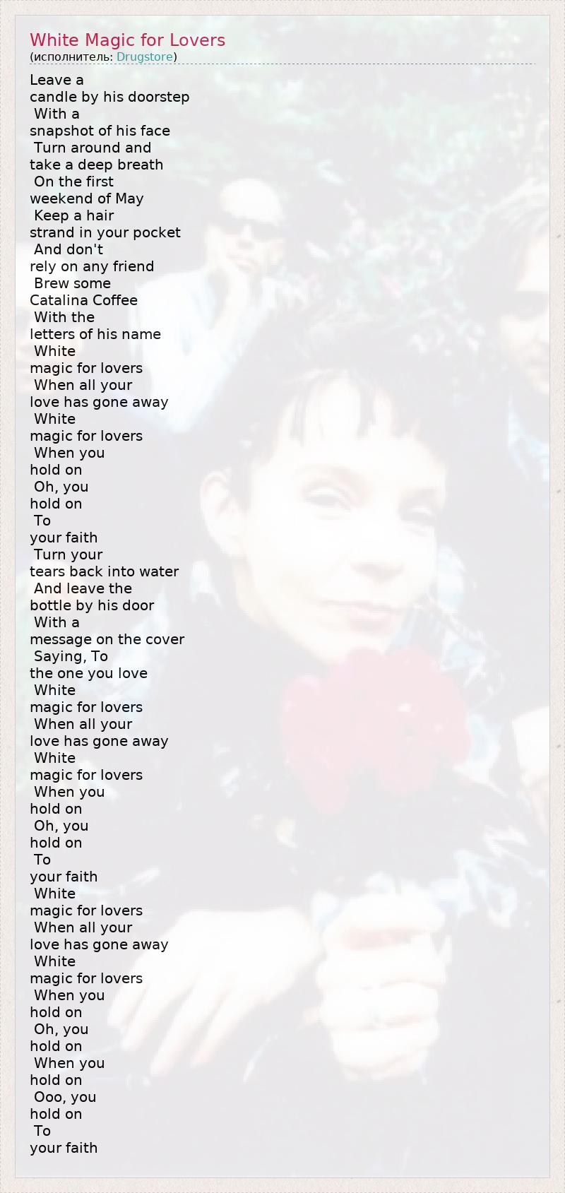 Leave a candle by his doorstep With a snapshot of his face Turn around and take a deep breath On the first weekend of May Keep a hair strand in your pocket And don't rely on any friend Brew some Catalina Coffee With the letters of his name White magic for lovers When all your love has gone away White magic for lovers When you hold on Oh, you hold on To your faith Turn your tears back into water And leave the bottle by his door With a message on the cover Saying, To the one you love White magic for lovers When all your love has gone away White magic for lovers When you hold on Oh, you hold on To your faith White magic for lovers When all your love has gone away White magic for lovers When you hold on Oh, you hold on When you hold on Ooo, you hold on To your faith