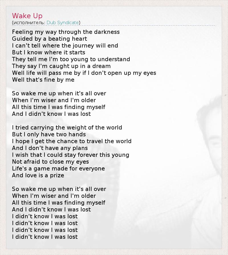 Нащупываю путь в темноте. Следуя голосу сердца, 1 Я не могу сказать, где завершится путь, Но я знаю, где он начинается. Мне говорят, что я слишком молод, чтобы что-то понимать, Говорят, что я во власти сна, Ну а жизнь пройдёт мимо, если я не открою глаза. Что ж, по-моему, это хорошо. Так разбудите меня, когда всё закончится, Когда я стану мудрее и старше. Всё это время я искал себя И не знал, что сбился с пути. Я пытался взвалить весь мир себе на плечи, Но у меня только две руки. Надеюсь, у меня появится шанс повидать мир, И я не строю планов. Хотел бы я остаться навечно таким же молодым И не бояться закрывать глаза. Жизнь – игра для всех и каждого, А любовь – награда в ней. Так разбудите меня, когда всё закончится, Когда я стану мудрее и старше. Всё это время я искал себя И не знал, что сбился с пути, Не знал, что сбился с пути, Не знал, что сбился с пути, Не знал, что сбился с пути, Не знал, что сбился с пути. 1 - буквально: ведомый бьющимся сердцем