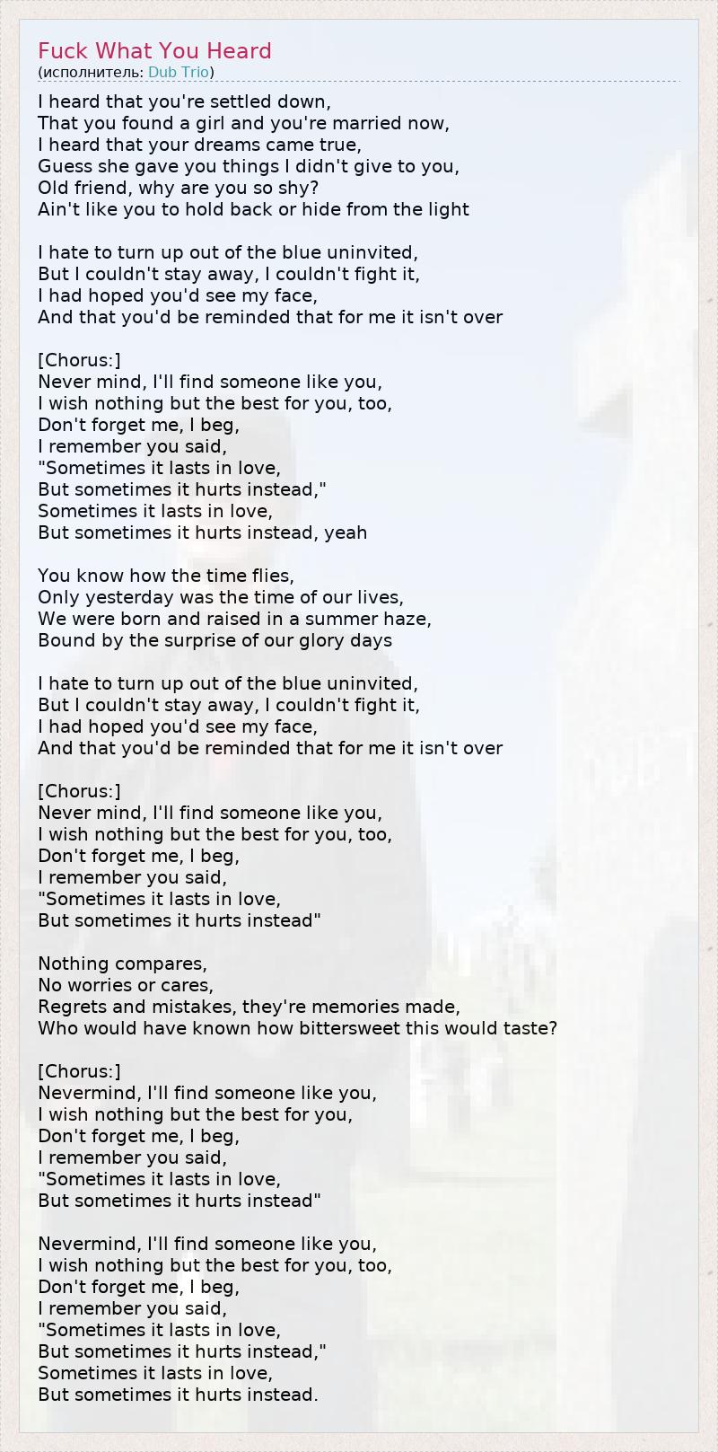 I heard that you're settled down, That you found a girl and you're married now, I heard that your dreams came true, Guess she gave you things I didn't give to you, Old friend, why are you so shy? Ain't like you to hold back or hide from the light I hate to turn up out of the blue uninvited, But I couldn't stay away, I couldn't fight it, I had hoped you'd see my face, And that you'd be reminded that for me it isn't over [Chorus:] Never mind, I'll find someone like you, I wish nothing but the best for you, too, Don't forget me, I beg, I remember you said, "Sometimes it lasts in love, But sometimes it hurts instead," Sometimes it lasts in love, But sometimes it hurts instead, yeah You know how the time flies, Only yesterday was the time of our lives, We were born and raised in a summer haze, Bound by the surprise of our glory days I hate to turn up out of the blue uninvited, But I couldn't stay away, I couldn't fight it, I had hoped you'd see my face, And that you'd be reminded that for me it isn't over [Chorus:] Never mind, I'll find someone like you, I wish nothing but the best for you, too, Don't forget me, I beg, I remember you said, "Sometimes it lasts in love, But sometimes it hurts instead" Nothing compares, No worries or cares, Regrets and mistakes, they're memories made, Who would have known how bittersweet this would taste? [Chorus:] Nevermind, I'll find someone like you, I wish nothing but the best for you, Don't forget me, I beg, I remember you said, "Sometimes it lasts in love, But sometimes it hurts instead" Nevermind, I'll find someone like you, I wish nothing but the best for you, too, Don't forget me, I beg, I remember you said, "Sometimes it lasts in love, But sometimes it hurts instead," Sometimes it lasts in love, But sometimes it hurts instead.