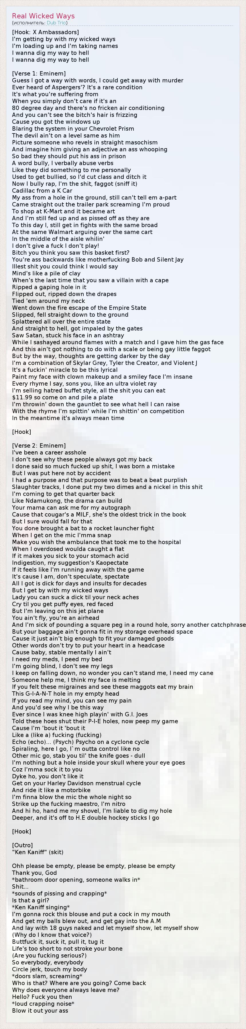 11 – Уолмарт – cеть однотипных универсальных магазинов, торгующих широким ассортиментом товаров по ценам ниже средних. Эти строчки говорят о том, что Эминем такой же, как и раньше, богатство не изменило его, а злоба не уменьшилась.