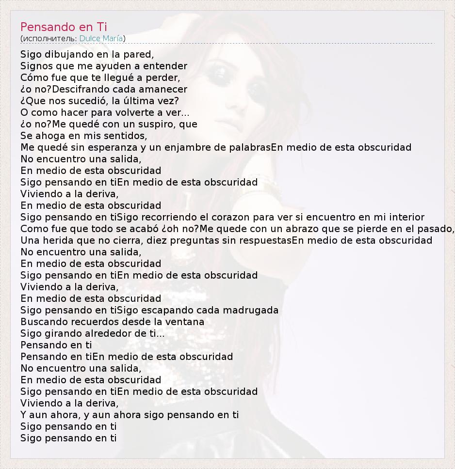 Sigo dibujando en la pared, Signos que me ayuden a entender Cómo fue que te llegué a perder, ¿o no?Descifrando cada amanecer ¿Que nos sucedió, la última vez? O como hacer para volverte a ver... ¿o no?Me quedé con un suspiro, que Se ahoga en mis sentidos, Me quedé sin esperanza y un enjambre de palabrasEn medio de esta obscuridad No encuentro una salida, En medio de esta obscuridad Sigo pensando en tiEn medio de esta obscuridad Viviendo a la deriva, En medio de esta obscuridad Sigo pensando en tiSigo recorriendo el corazon para ver si encuentro en mi interior Como fue que todo se acabó ¿oh no?Me quede con un abrazo que se pierde en el pasado, Una herida que no cierra, diez preguntas sin respuestasEn medio de esta obscuridad No encuentro una salida, En medio de esta obscuridad Sigo pensando en tiEn medio de esta obscuridad Viviendo a la deriva, En medio de esta obscuridad Sigo pensando en tiSigo escapando cada madrugada Buscando recuerdos desde la ventana Sigo girando alrededor de ti... Pensando en ti Pensando en tiEn medio de esta obscuridad No encuentro una salida, En medio de esta obscuridad Sigo pensando en tiEn medio de esta obscuridad Viviendo a la deriva, Y aun ahora, y aun ahora sigo pensando en ti Sigo pensando en ti Sigo pensando en ti