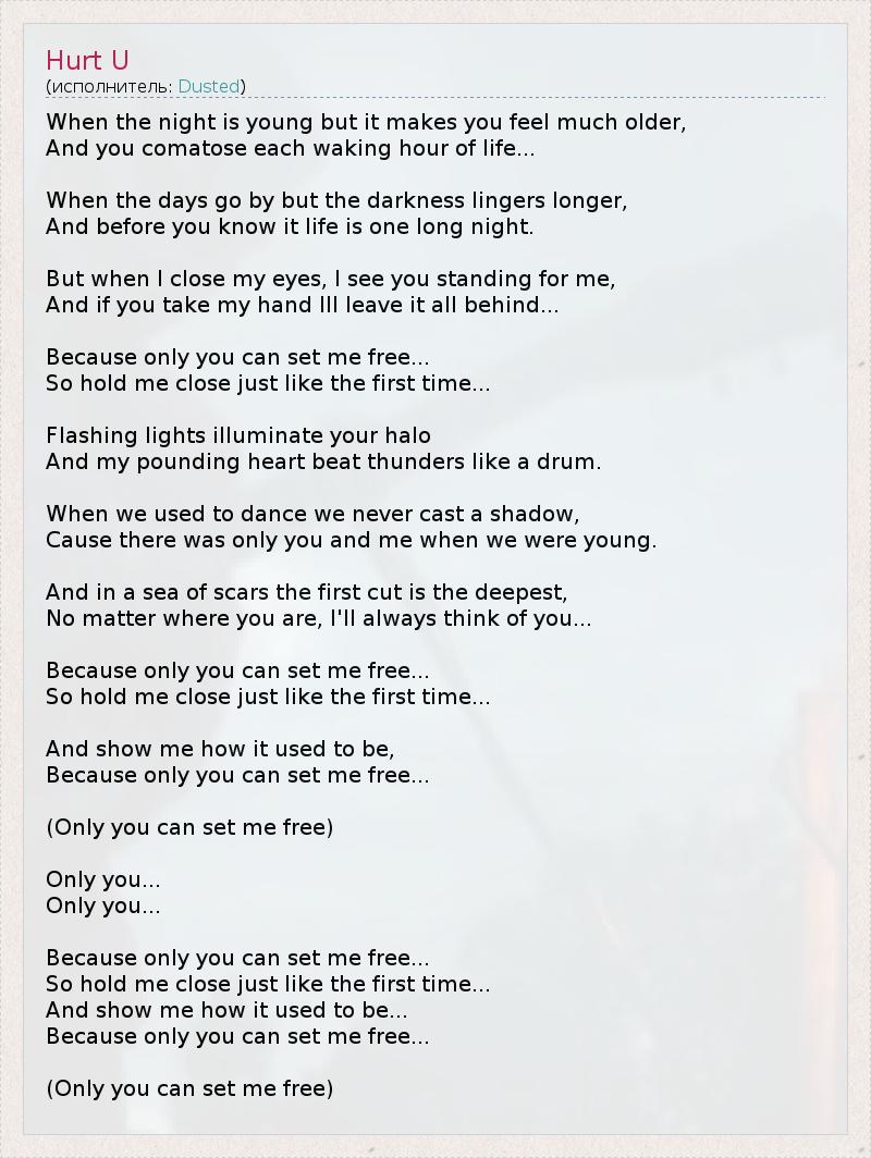 Когда ночь юна, но делает тебя старше, И когда наяву ты словно во сне... Когда дни пролетают, а тьма остаётся, Не успеваешь это осознать, как жизнь превращается в одну сплошную ночь. Но когда я закрываю глаза, я вижу тебя рядом, И если ты возьмёшь меня за руку, всё это я оставлю позади... Ведь только ты даруешь мне свободу... Так обними же меня крепче, словно в первый раз... Светящиеся огни озаряют твой нимб, И удары моего сердца стучат, как раскаты грома. Когда мы танцевали, мы не отбрасывали тени, Ведь в юности существовали только ты и я. В море шрамов первая рана - самая глубокая, Неважно, где ты, я всегда буду думать о тебе... Ведь только ты можешь освободить меня... Так обними же меня крепче, словно в первый раз... И покажи мне, как это было, Потому что только ты можешь освободить меня... (Только ты можешь освободить меня) Только ты... Только ты... Ведь только ты даруешь мне свободу... Так обними же меня крепче, словно в первый раз... И покажи мне, как это было, Потому что только ты можешь освободить меня... (Лишь ты можешь освободить меня...)