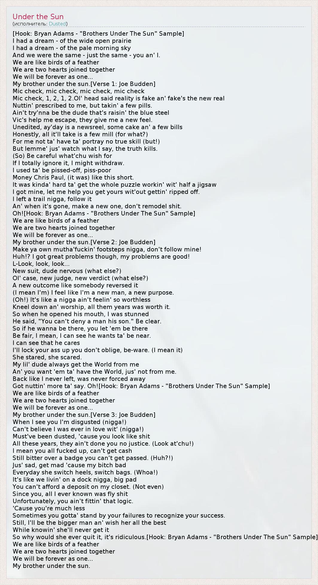 [Hook: Bryan Adams - "Brothers Under The Sun" Sample] I had a dream - of the wide open prairie I had a dream - of the pale morning sky And we were the same - just the same - you an' I. We are like birds of a feather We are two hearts joined together We will be forever as one... My brother under the sun.[Verse 1: Joe Budden] Mic check, mic check, mic check, mic check Mic check, 1, 2, 1, 2.Ol' head said reality is fake an' fake's the new real Nuttin' prescribed to me, but takin' a few pills. Ain't try'nna be the dude that's raisin' the blue steel Vic's help me escape, they give me a new feel. Unedited, ay'day is a newsreel, some cake an' a few bills Honestly, all it'll take is a few mill (for what?) For me not ta' have ta' portray no true skill (but!) But lemme' jus' watch what I say, the truth kills. (So) Be careful what'chu wish for If I totally ignore it, I might withdraw. I used ta' be pissed-off, piss-poor Money Chris Paul, (it was) like this short. It was kinda' hard ta' get the whole puzzle workin' wit' half a jigsaw I got mine, let me help you get yours wit'out gettin' ripped off. I left a trail nigga, follow it An' when it's gone, make a new one, don't remodel shit. Oh![Hook: Bryan Adams - "Brothers Under The Sun" Sample] We are like birds of a feather We are two hearts joined together We will be forever as one... My brother under the sun.[Verse 2: Joe Budden] Make ya own mutha'fuckin' footsteps nigga, don't follow mine! Huh!? I got great problems though, my problems are good! L-Look, look, look... New suit, dude nervous (what else?) Ol' case, new judge, new verdict (what else?) A new outcome like somebody reversed it (I mean I'm) I feel like I'm a new man, a new purpose. (Oh!) It's like a nigga ain't feelin' so worthless Kneel down an' worship, all them years was worth it. So when he opened his mouth, I was stunned He said, "You can't deny a man his son." Be clear. So if he wanna be there, you let 'em be there Be fair, I mean, I can see he wants ta' be near. I can see that he cares I'll lock your ass up you don't oblige, be-ware. (I mean it) She stared, she scared. My lil' dude always get the World from me An' you want 'em ta' have the World, jus' not from me. Back like I never left, was never forced away Got nuttin' more ta' say. Oh![Hook: Bryan Adams - "Brothers Under The Sun" Sample] We are like birds of a feather We are two hearts joined together We will be forever as one... My brother under the sun.[Verse 3: Joe Budden] When I see you I'm disgusted (nigga!) Can't believe I was ever in love wit' (nigga!) Must've been dusted, 'cause you look like shit All these years, they ain't done you no justice. (Look at'chu!) I mean you all fucked up, can't get cash Still bitter over a badge you can't get passed. (Huh?!) Jus' sad, get mad 'cause my bitch bad Everyday she switch heels, switch bags. (Whoa!) It's like we livin' on a dock nigga, big pad You can't afford a deposit on my closet. (Not even) Since you, all I ever known was fly shit Unfortunately, you ain't fittin' that logic. 'Cause you're much less Sometimes you gotta' stand by your failures to recognize your success. Still, I'll be the bigger man an' wish her all the best While knowin' she'll never get it So why would she ever quit it, it's ridiculous.[Hook: Bryan Adams - "Brothers Under The Sun" Sample] We are like birds of a feather We are two hearts joined together We will be forever as one... My brother under the sun.