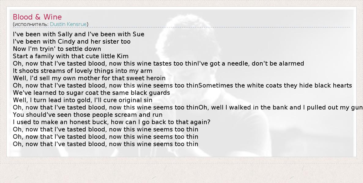 I've been with Sally and I've been with Sue I've been with Cindy and her sister too Now I'm tryin' to settle down Start a family with that cute little Kim Oh, now that I've tasted blood, now this wine tastes too thinI've got a needle, don't be alarmed It shoots streams of lovely things into my arm Well, I'd sell my own mother for that sweet heroin Oh, now that I've tasted blood, now this wine seems too thinSometimes the white coats they hide black hearts We've learned to sugar coat the same black guards Well, I turn lead into gold, I'll cure original sin Oh, now that I've tasted blood, now this wine seems too thinOh, well I walked in the bank and I pulled out my gun You should've seen those people scream and run I used to make an honest buck, how can I go back to that again? Oh, now that I've tasted blood, now this wine seems too thin Oh, now that I've tasted blood, now this wine seems too thin Oh, now that I've tasted blood, now this wine seems too thin