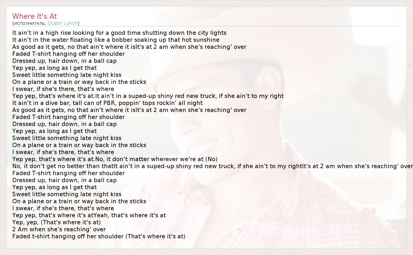 It ain't in a high rise looking for a good time shutting down the city lights It ain't in the water floating like a bobber soaking up that hot sunshine As good as it gets, no that ain't where it isIt's at 2 am when she's reaching' over Faded T-shirt hanging off her shoulder Dressed up, hair down, in a ball cap Yep yep, as long as I get that Sweet little something late night kiss On a plane or a train or way back in the sticks I swear, if she's there, that's where Yep yep, that's where it's at.It ain't in a suped-up shiny red new truck, if she ain't to my right It ain't in a dive bar, tall can of PBR, poppin' tops rockin' all night As good as it gets, no that ain't where it isIt's at 2 am when she's reaching' over Faded T-shirt hanging off her shoulder Dressed up, hair down, in a ball cap Yep yep, as long as I get that Sweet little something late night kiss On a plane or a train or way back in the sticks I swear, if she's there, that's where Yep yep, that's where it's at.No, it don't matter wherever we're at (No) No, it don't get no better than thatIt ain't in a suped-up shiny red new truck, if she ain't to my rightIt's at 2 am when she's reaching' over Faded T-shirt hanging off her shoulder Dressed up, hair down, in a ball cap Yep yep, as long as I get that Sweet little something late night kiss On a plane or a train or way back in the sticks I swear, if she's there, that's where Yep yep, that's where it's atYeah, that's where it's at Yep, yep, (That's where it's at) 2 Am when she's reaching' over Faded t-shirt hanging off her shoulder (That's where it's at)