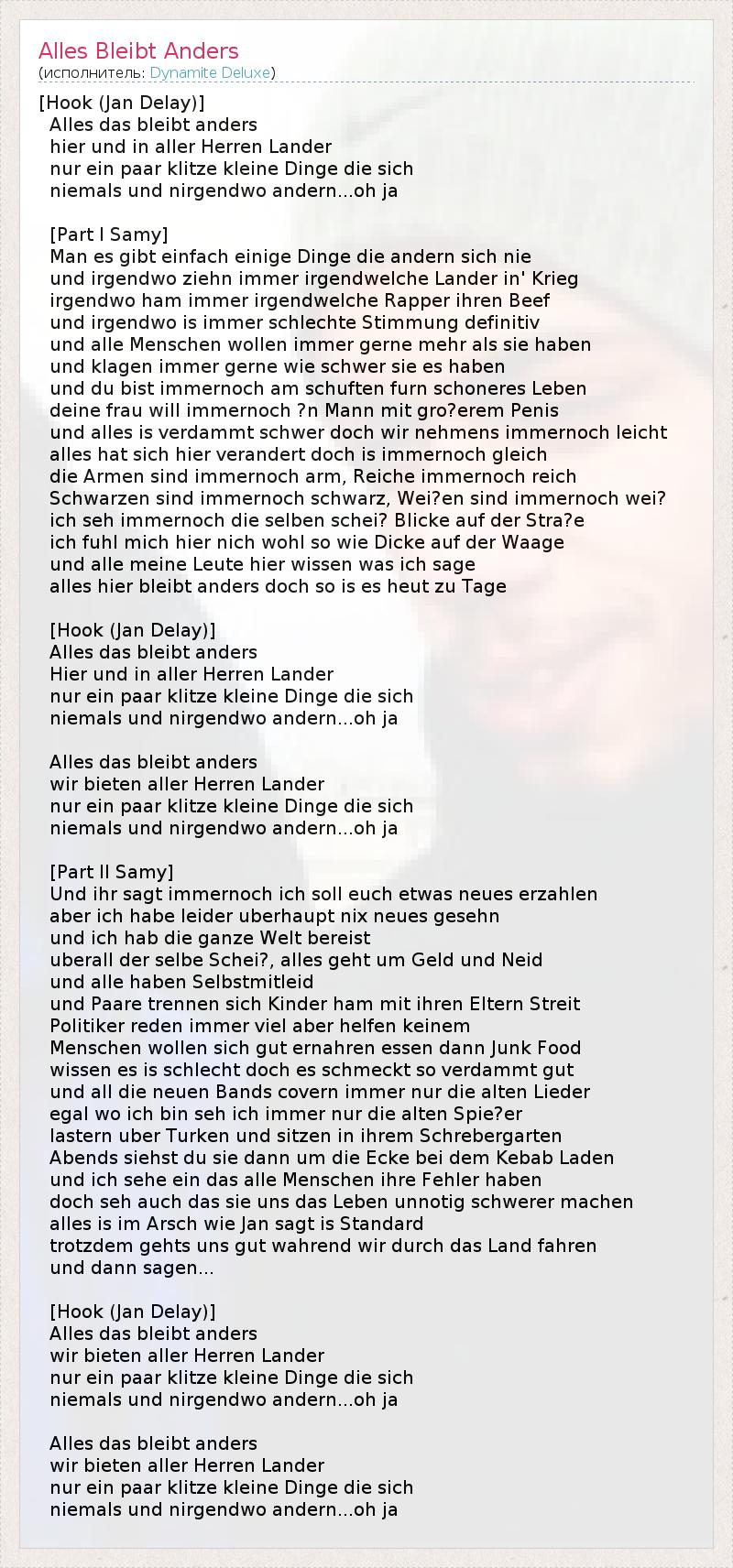 [Hook (Jan Delay)] Alles das bleibt anders hier und in aller Herren Lander nur ein paar klitze kleine Dinge die sich niemals und nirgendwo andern...oh ja [Part I Samy] Man es gibt einfach einige Dinge die andern sich nie und irgendwo ziehn immer irgendwelche Lander in' Krieg irgendwo ham immer irgendwelche Rapper ihren Beef und irgendwo is immer schlechte Stimmung definitiv und alle Menschen wollen immer gerne mehr als sie haben und klagen immer gerne wie schwer sie es haben und du bist immernoch am schuften furn schoneres Leben deine frau will immernoch ?n Mann mit gro?erem Penis und alles is verdammt schwer doch wir nehmens immernoch leicht alles hat sich hier verandert doch is immernoch gleich die Armen sind immernoch arm, Reiche immernoch reich Schwarzen sind immernoch schwarz, Wei?en sind immernoch wei? ich seh immernoch die selben schei? Blicke auf der Stra?e ich fuhl mich hier nich wohl so wie Dicke auf der Waage und alle meine Leute hier wissen was ich sage alles hier bleibt anders doch so is es heut zu Tage [Hook (Jan Delay)] Alles das bleibt anders Hier und in aller Herren Lander nur ein paar klitze kleine Dinge die sich niemals und nirgendwo andern...oh ja Alles das bleibt anders wir bieten aller Herren Lander nur ein paar klitze kleine Dinge die sich niemals und nirgendwo andern...oh ja [Part II Samy] Und ihr sagt immernoch ich soll euch etwas neues erzahlen aber ich habe leider uberhaupt nix neues gesehn und ich hab die ganze Welt bereist uberall der selbe Schei?, alles geht um Geld und Neid und alle haben Selbstmitleid und Paare trennen sich Kinder ham mit ihren Eltern Streit Politiker reden immer viel aber helfen keinem Menschen wollen sich gut ernahren essen dann Junk Food wissen es is schlecht doch es schmeckt so verdammt gut und all die neuen Bands covern immer nur die alten Lieder egal wo ich bin seh ich immer nur die alten Spie?er lastern uber Turken und sitzen in ihrem Schrebergarten Abends siehst du sie dann um die Ecke bei dem Kebab Laden und ich sehe ein das alle Menschen ihre Fehler haben doch seh auch das sie uns das Leben unnotig schwerer machen alles is im Arsch wie Jan sagt is Standard trotzdem gehts uns gut wahrend wir durch das Land fahren und dann sagen... [Hook (Jan Delay)] Alles das bleibt anders wir bieten aller Herren Lander nur ein paar klitze kleine Dinge die sich niemals und nirgendwo andern...oh ja Alles das bleibt anders wir bieten aller Herren Lander nur ein paar klitze kleine Dinge die sich niemals und nirgendwo andern...oh ja
