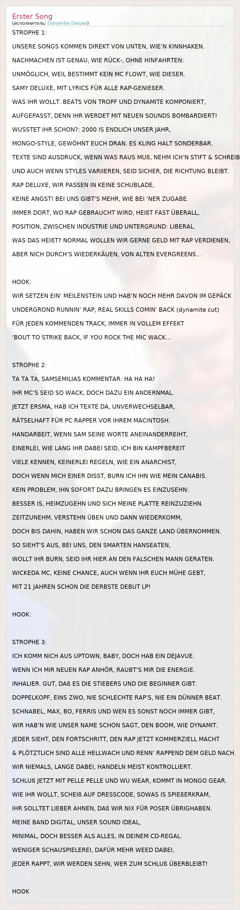 STROPHE 1: UNSERE SONGS KOMMEN DIREKT VON UNTEN, WIE'N KINNHAKEN. NACHMACHEN IST GENAU, WIE RÜCK-, OHNE HINFAHRTEN: UNMÖGLICH, WEIL BESTIMMT KEIN MC FLOWT, WIE DIESER. SAMY DELUXE, MIT LYRICS FÜR ALLE RAP-GENIEßER. WAS IHR WOLLT. BEATS VON TROPF UND DYNAMITE KOMPONIERT, AUFGEPASST, DENN IHR WERDET MIT NEUEN SOUNDS BOMBARDIERT! WUSSTET IHR SCHON?: 2000 IS ENDLICH UNSER JAHR, MONGO-STYLE, GEWÖHNT EUCH DRAN. ES KLING HALT SONDERBAR. TEXTE SIND AUSDRUCK, WENN WAS RAUS MUß, NEHM ICH'N STIFT & SCHREIB UND AUCH WENN STYLES VARIIEREN, SEID SICHER, DIE RICHTUNG BLEIBT. RAP DELUXE, WIR PASSEN IN KEINE SCHUBLADE, KEINE ANGST! BEI UNS GIBT'S MEHR, WIE BEI 'NER ZUGABE. IMMER DORT, WO RAP GEBRAUCHT WIRD, HEIßT FAST ÜBERALL, POSITION, ZWISCHEN INDUSTRIE UND UNTERGRUND: LIBERAL. WAS DAS HEIßT? NORMAL WOLLEN WIR GERNE GELD MIT RAP VERDIENEN, ABER NICH DURCH'S WIEDERKÄUEN, VON ALTEN EVERGREENS... HOOK: WIR SETZEN EIN' MEILENSTEIN UND HAB'N NOCH MEHR DAVON IM GEPÄCK UNDERGROND RUNNIN' RAP, REAL SKILLS COMIN' BACK (dynamite cut) FÜR JEDEN KOMMENDEN TRACK, IMMER IN VOLLEM EFFEKT 'BOUT TO STRIKE BACK, IF YOU ROCK THE MIC WACK... STROPHE 2: TA TA TA, SAMSEMILIAS KOMMENTAR: HA HA HA! IHR MC'S SEID SO WACK, DOCH DAZU EIN ANDERNMAL. JETZT ERSMA, HAB ICH TEXTE DA, UNVERWECHSELBAR, RÄTSELHAFT FÜR PC RAPPER VOR IHREM MACINTOSH. HANDARBEIT, WENN SAM SEINE WORTE ANEINANDERREIHT, EINERLEI, WIE LANG IHR DABEI SEID, ICH BIN KAMPFBEREIT. VIELE KENNEN, KEINERLEI REGELN, WIE EIN ANARCHIST, DOCH WENN MICH EINER DISST, BURN ICH IHN WIE MEIN CANABIS. KEIN PROBLEM, IHN SOFORT DAZU BRINGEN ES EINZUSEHN: BESSER IS, HEIMZUGEHN UND SICH MEINE PLATTE REINZUZIEHN. ZEITZUNEHM, VERSTEHN ÜBEN UND DANN WIEDERKOMM, DOCH BIS DAHIN, HABEN WIR SCHON DAS GANZE LAND ÜBERNOMMEN. SO SIEHT'S AUS, BEI UNS, DEN SMARTEN HANSEATEN, WOLLT IHR BURN, SEID IHR HIER AN DEN FALSCHEN MANN GERATEN. WICKEDA MC, KEINE CHANCE, AUCH WENN IHR EUCH MÜHE GEBT, MIT 21 JAHREN SCHON DIE DERBSTE DEBUT LP! HOOK: STROPHE 3: ICH KOMM NICH AUS UPTOWN, BABY, DOCH HAB EIN DEJAVUE. WENN ICH MIR NEUEN RAP ANHÖR, RAUBT'S MIR DIE ENERGIE. INHALIER. GUT, DAß ES DIE STIEBERS UND DIE BEGINNER GIBT. DOPPELKOPF, EINS ZWO, NIE SCHLECHTE RAP'S, NIE EIN DÜNNER BEAT. SCHNABEL, MAX, BO, FERRIS UND WEN ES SONST NOCH IMMER GIBT, WIR HAB'N WIE UNSER NAME SCHON SAGT, DEN BOOM, WIE DYNAMIT. JEDER SIEHT, DEN FORTSCHRITT, DEN RAP JETZT KOMMERZIELL MACHT & PLÖTZTLICH SIND ALLE HELLWACH UND RENN' RAPPEND DEM GELD NACH. WIR NIEMALS, LANGE DABEI, HANDELN MEIST KONTROLLIERT. SCHLUß JETZT MIT PELLE PELLE UND WU WEAR, KOMMT IN MONGO GEAR. WIE IHR WOLLT, SCHEIß AUF DRESSCODE, SOWAS IS SPIEßERKRAM, IHR SOLLTET LIEBER AHNEN, DAß WIR NIX FÜR POSER ÜBRIGHABEN. MEINE BAND DIGITAL, UNSER SOUND IDEAL, MINIMAL, DOCH BESSER ALS ALLES, IN DEINEM CD-REGAL. WENIGER SCHAUSPIELEREI, DAFÜR MEHR WEED DABEI, JEDER RAPPT, WIR WERDEN SEHN, WER ZUM SCHLUß ÜBERBLEIBT! HOOK