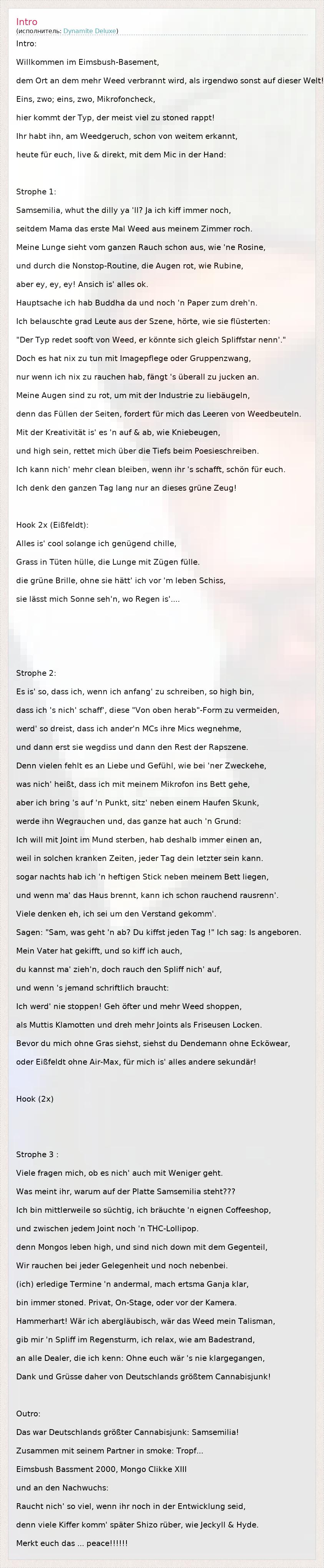 Intro: Willkommen im Eimsbush-Basement, dem Ort an dem mehr Weed verbrannt wird, als irgendwo sonst auf dieser Welt! Eins, zwo; eins, zwo, Mikrofoncheck, hier kommt der Typ, der meist viel zu stoned rappt! Ihr habt ihn, am Weedgeruch, schon von weitem erkannt, heute für euch, live & direkt, mit dem Mic in der Hand: Strophe 1: Samsemilia, whut the dilly ya 'll? Ja ich kiff immer noch, seitdem Mama das erste Mal Weed aus meinem Zimmer roch. Meine Lunge sieht vom ganzen Rauch schon aus, wie 'ne Rosine, und durch die Nonstop-Routine, die Augen rot, wie Rubine, aber ey, ey, ey! Ansich is' alles ok. Hauptsache ich hab Buddha da und noch 'n Paper zum dreh'n. Ich belauschte grad Leute aus der Szene, hörte, wie sie flüsterten: "Der Typ redet sooft von Weed, er könnte sich gleich Spliffstar nenn'." Doch es hat nix zu tun mit Imagepflege oder Gruppenzwang, nur wenn ich nix zu rauchen hab, fängt 's überall zu jucken an. Meine Augen sind zu rot, um mit der Industrie zu liebäugeln, denn das Füllen der Seiten, fordert für mich das Leeren von Weedbeuteln. Mit der Kreativität is' es 'n auf & ab, wie Kniebeugen, und high sein, rettet mich über die Tiefs beim Poesieschreiben. Ich kann nich' mehr clean bleiben, wenn ihr 's schafft, schön für euch. Ich denk den ganzen Tag lang nur an dieses grüne Zeug! Hook 2x (Eißfeldt): Alles is' cool solange ich genügend chille, Grass in Tüten hülle, die Lunge mit Zügen fülle. die grüne Brille, ohne sie hätt' ich vor 'm leben Schiss, sie lässt mich Sonne seh'n, wo Regen is'.... Strophe 2: Es is' so, dass ich, wenn ich anfang' zu schreiben, so high bin, dass ich 's nich' schaff', diese "Von oben herab"-Form zu vermeiden, werd' so dreist, dass ich ander'n MCs ihre Mics wegnehme, und dann erst sie wegdiss und dann den Rest der Rapszene. Denn vielen fehlt es an Liebe und Gefühl, wie bei 'ner Zweckehe, was nich' heißt, dass ich mit meinem Mikrofon ins Bett gehe, aber ich bring 's auf 'n Punkt, sitz' neben einem Haufen Skunk, werde ihn Wegrauchen und, das ganze hat auch 'n Grund: Ich will mit Joint im Mund sterben, hab deshalb immer einen an, weil in solchen kranken Zeiten, jeder Tag dein letzter sein kann. sogar nachts hab ich 'n heftigen Stick neben meinem Bett liegen, und wenn ma' das Haus brennt, kann ich schon rauchend rausrenn'. Viele denken eh, ich sei um den Verstand gekomm'. Sagen: "Sam, was geht 'n ab? Du kiffst jeden Tag !" Ich sag: Is angeboren. Mein Vater hat gekifft, und so kiff ich auch, du kannst ma' zieh'n, doch rauch den Spliff nich' auf, und wenn 's jemand schriftlich braucht: Ich werd' nie stoppen! Geh öfter und mehr Weed shoppen, als Muttis Klamotten und dreh mehr Joints als Friseusen Locken. Bevor du mich ohne Gras siehst, siehst du Dendemann ohne Ecköwear, oder Eißfeldt ohne Air-Max, für mich is' alles andere sekundär! Hook (2x) Strophe 3 : Viele fragen mich, ob es nich' auch mit Weniger geht. Was meint ihr, warum auf der Platte Samsemilia steht??? Ich bin mittlerweile so süchtig, ich bräuchte 'n eignen Coffeeshop, und zwischen jedem Joint noch 'n THC-Lollipop. denn Mongos leben high, und sind nich down mit dem Gegenteil, Wir rauchen bei jeder Gelegenheit und noch nebenbei. (ich) erledige Termine 'n andermal, mach ertsma Ganja klar, bin immer stoned. Privat, On-Stage, oder vor der Kamera. Hammerhart! Wär ich abergläubisch, wär das Weed mein Talisman, gib mir 'n Spliff im Regensturm, ich relax, wie am Badestrand, an alle Dealer, die ich kenn: Ohne euch wär 's nie klargegangen, Dank und Grüsse daher von Deutschlands größtem Cannabisjunk! Outro: Das war Deutschlands größter Cannabisjunk: Samsemilia! Zusammen mit seinem Partner in smoke: Tropf... Eimsbush Bassment 2000, Mongo Clikke XIII und an den Nachwuchs: Raucht nich' so viel, wenn ihr noch in der Entwicklung seid, denn viele Kiffer komm' später Shizo rüber, wie Jeckyll & Hyde. Merkt euch das ... peace!!!!!!