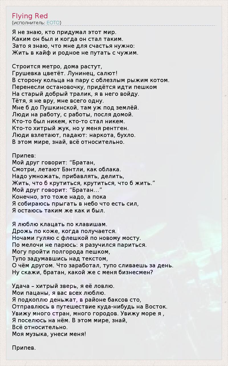 Я не знаю, кто придумал этот мир. Каким он был и когда он стал таким. Зато я знаю, что мне для счастья нужно: Жить в кайф и родное не путать с чужим. Строится метро, дома растут, Грушевка цветёт. Лунинец, салют! В сторону кольца на пару с облезлым рыжим котом. Перенесли остановочку, придётся идти пешком На старый добрый тралик, я в него войду. Тётя, я не вру, мне всего одну. Мне б до Пушкинской, там уж под землёй. Люди на работу, с работы, посля домой. Кто-то был никем, кто-то стал никем. Кто-то хитрый жук, но у меня рентген. Люди взлетают, падают: наркота, бухло. В этом мире, знай, всё относительно. Припев: Мой друг говорит: “Братан, Смотри, летают Бэнтли, как облака. Надо умножать, прибавлять, делить, Жить, что б крутиться, крутиться, что б жить.” Мой друг говорит: “Братан…” Конечно, это тоже надо, а пока Я собираюсь прыгать в небо что есть сил, Я остаюсь таким же как и был. Я люблю клацать по клавишам. Дрожь по коже, когда получается. Ночами гуляю с флешкой по новому мосту. По мелочи не парюсь: я разучился париться. Могу пройти полгорода пешком, Тупо задумавшись над текстом, О чём другом. Что заработал, тупо сливаешь за день. Ну скажи, братан, какой же с меня бизнесмен? Удача – хитрый зверь, я её ловлю. Мои пацаны, я вас всех люблю. Я подкоплю деньжат, в районе баксов сто, Отправлюсь в путешествие куда-нибудь на Восток. Увижу много стран, много городов. Увижу море я , Я поселюсь на нём. В этом мире, знай, Всё относительно. Моя музыка, унеси меня! Припев.