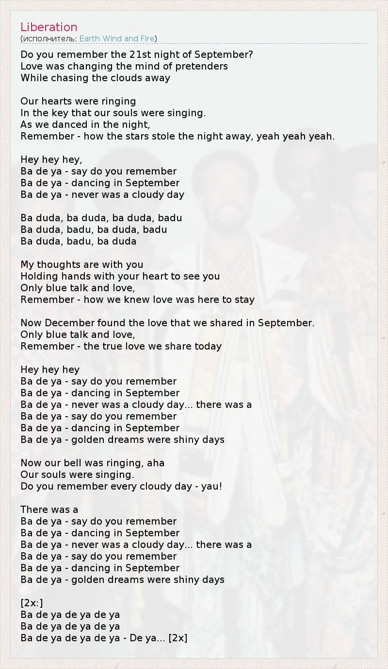 Ты помнишь 21-ую ночь сентября? Тогда любовь преобразила взгляды двух притворщиков, Разогнав покров тьмы. Наши сердца звенели В том же ключе, в котором пели наши души. Пока мы танцевали в ночи, Помнишь, как ярко её осветили звёзды? 1 Да, да, да! Эй, эй, эй Ба-ду-а - скажи, ты помнишь... Ба-ду-а - танец в сентябре? Ба-ду-а - в тот день не было ни облачка. Ба-дуда, ба-дуда, ба-дуда, баду Ба-дуда, баду, ба-дуда, баду Ба-дуда, баду, ба-дуба Мои мысли с тобой, Прикасаюсь к твоей душе, 2 чтобы увидеть тебя. Лишь непристойные разговоры и любовь... Помнишь, как нам стало ясно, что эта любовь навсегда? Теперь декабрь познал любовь, которую мы разделили в сентябре. Лишь непристойные разговоры и любовь... Помни: настоящая любовь - та, что мы испытываем сейчас. Эй, эй, эй Ба-ду-а - скажи, ты помнишь... Ба-ду-а - танец в сентябре? Ба-ду-а - в тот день не было ни облачка. Было... Ба-ду-а - скажи, ты помнишь... Ба-ду-а - танец в сентябре? Ба-ду-а - голубой мечтой были те солнечные дни. Теперь звонил наш колокольчик, ага, Наши души пели. Ты помнишь каждый облачный день? Да! Было... Ба-ду-а - скажи, ты помнишь... Ба-ду-а - танец в сентябре? Ба-ду-а - в тот день не было ни облачка. Было... Ба-ду-а - скажи, ты помнишь... Ба-ду-а - танец в сентябре? Ба-ду-а - голубой мечтой были те солнечные дни. [2x:] Ба-ду-а, ду-а, ду-а. Ба-ду-а, ду-а, ду-а. Ба-ду-а, ду-а, ду-а... 1 - буквально: Помнишь, как звёзды её [ночь] украли? 2 - буквально: пожимаю руки твоей душе/сердцу 3 - фразеологизм: ring the/one's bell ~ приходить на память, казаться знакомым, напоминать