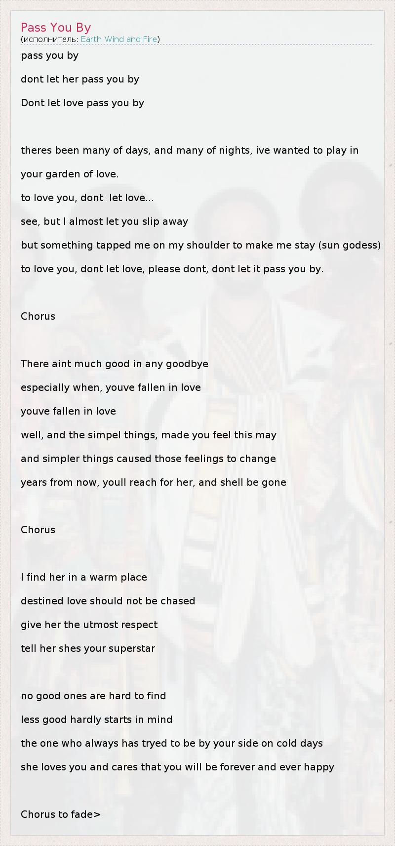 pass you by dont let her pass you by Dont let love pass you by theres been many of days, and many of nights, ive wanted to play in your garden of love. to love you, dont let love... see, but I almost let you slip away but something tapped me on my shoulder to make me stay (sun godess) to love you, dont let love, please dont, dont let it pass you by. Chorus There aint much good in any goodbye especially when, youve fallen in love youve fallen in love well, and the simpel things, made you feel this may and simpler things caused those feelings to change years from now, youll reach for her, and shell be gone Chorus I find her in a warm place destined love should not be chased give her the utmost respect tell her shes your superstar no good ones are hard to find less good hardly starts in mind the one who always has tryed to be by your side on cold days she loves you and cares that you will be forever and ever happy Chorus to fade>