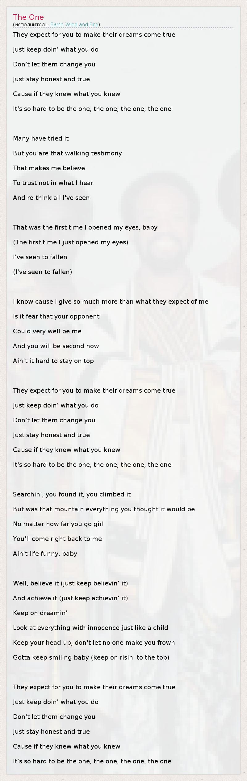 They expect for you to make their dreams come true Just keep doin' what you do Don't let them change you Just stay honest and true Cause if they knew what you knew It's so hard to be the one, the one, the one, the one Many have tried it But you are that walking testimony That makes me believe To trust not in what I hear And re-think all I've seen That was the first time I opened my eyes, baby (The first time I just opened my eyes) I've seen to fallen (I've seen to fallen) I know cause I give so much more than what they expect of me Is it fear that your opponent Could very well be me And you will be second now Ain't it hard to stay on top They expect for you to make their dreams come true Just keep doin' what you do Don't let them change you Just stay honest and true Cause if they knew what you knew It's so hard to be the one, the one, the one, the one Searchin', you found it, you climbed it But was that mountain everything you thought it would be No matter how far you go girl You'll come right back to me Ain't life funny, baby Well, believe it (just keep believin' it) And achieve it (just keep achievin' it) Keep on dreamin' Look at everything with innocence just like a child Keep your head up, don't let no one make you frown Gotta keep smiling baby (keep on risin' to the top) They expect for you to make their dreams come true Just keep doin' what you do Don't let them change you Just stay honest and true Cause if they knew what you knew It's so hard to be the one, the one, the one, the one
