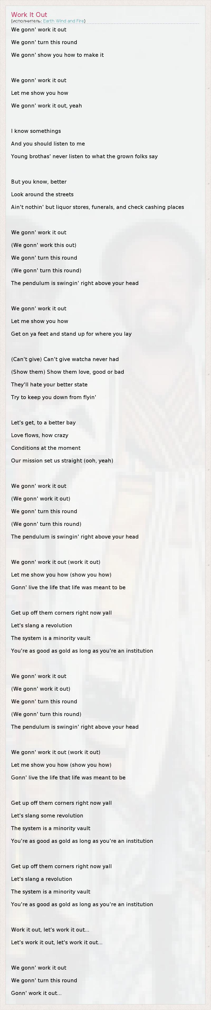 We gonn' work it out We gonn' turn this round We gonn' show you how to make it We gonn' work it out Let me show you how We gonn' work it out, yeah I know somethings And you should listen to me Young brothas' never listen to what the grown folks say But you know, better Look around the streets Ain't nothin' but liquor stores, funerals, and check cashing places We gonn' work it out (We gonn' work this out) We gonn' turn this round (We gonn' turn this round) The pendulum is swingin' right above your head We gonn' work it out Let me show you how Get on ya feet and stand up for where you lay (Can't give) Can't give watcha never had (Show them) Show them love, good or bad They'll hate your better state Try to keep you down from flyin' Let's get, to a better bay Love flows, how crazy Conditions at the moment Our mission set us straight (ooh, yeah) We gonn' work it out (We gonn' work it out) We gonn' turn this round (We gonn' turn this round) The pendulum is swingin' right above your head We gonn' work it out (work it out) Let me show you how (show you how) Gonn' live the life that life was meant to be Get up off them corners right now yall Let's slang a revolution The system is a minority vault You're as good as gold as long as you're an institution We gonn' work it out (We gonn' work it out) We gonn' turn this round (We gonn' turn this round) The pendulum is swingin' right above your head We gonn' work it out (work it out) Let me show you how (show you how) Gonn' live the life that life was meant to be Get up off them corners right now yall Let's slang some revolution The system is a minority vault You're as good as gold as long as you're an institution Get up off them corners right now yall Let's slang a revolution The system is a minority vault You're as good as gold as long as you're an institution Work it out, let's work it out... Let's work it out, let's work it out... We gonn' work it out We gonn' turn this round Gonn' work it out...