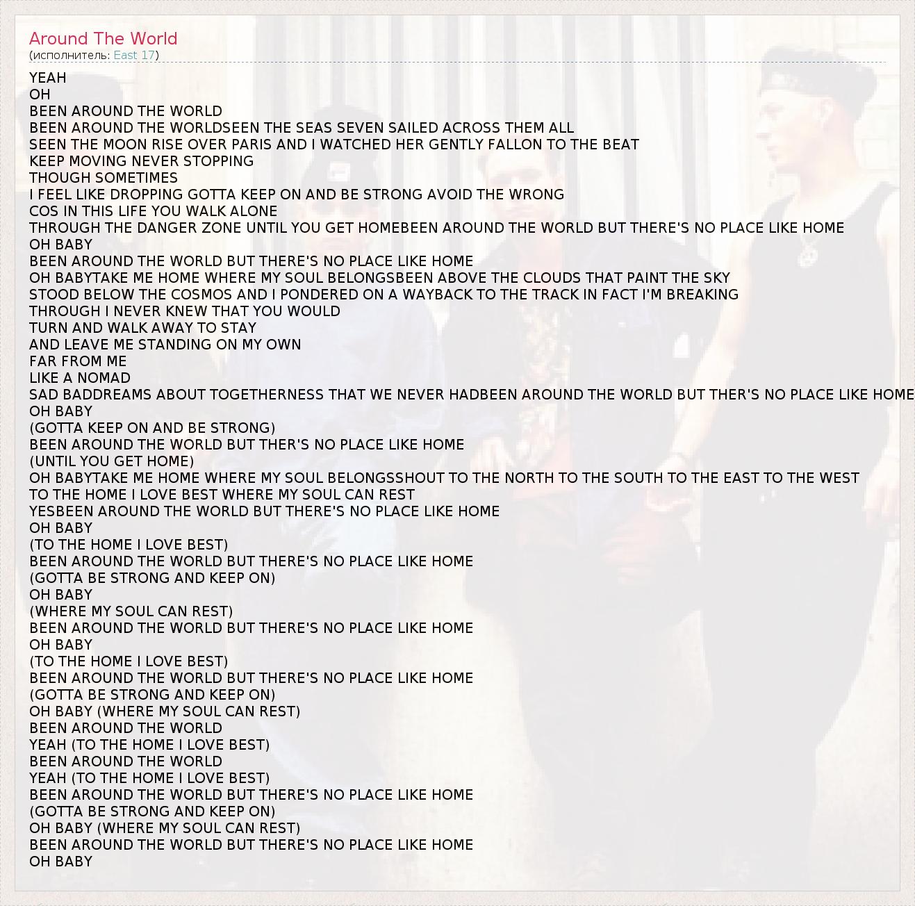 THROUGH THE DANGER ZONE UNTIL YOU GET HOMEBEEN AROUND THE WORLD BUT THERE'S NO PLACE LIKE HOME