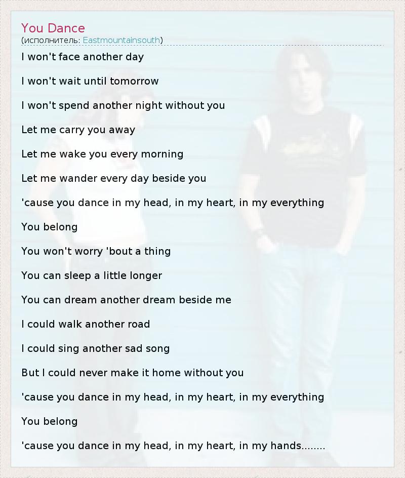 I won't face another day I won't wait until tomorrow I won't spend another night without you Let me carry you away Let me wake you every morning Let me wander every day beside you 'cause you dance in my head, in my heart, in my everything You belong You won't worry 'bout a thing You can sleep a little longer You can dream another dream beside me I could walk another road I could sing another sad song But I could never make it home without you 'cause you dance in my head, in my heart, in my everything You belong 'cause you dance in my head, in my heart, in my hands........