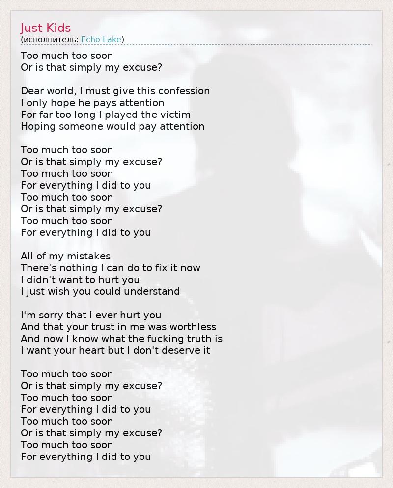 Too much too soon Or is that simply my excuse? Dear world, I must give this confession I only hope he pays attention For far too long I played the victim Hoping someone would pay attention Too much too soon Or is that simply my excuse? Too much too soon For everything I did to you Too much too soon Or is that simply my excuse? Too much too soon For everything I did to you All of my mistakes There's nothing I can do to fix it now I didn't want to hurt you I just wish you could understand I'm sorry that I ever hurt you And that your trust in me was worthless And now I know what the fucking truth is I want your heart but I don't deserve it Too much too soon Or is that simply my excuse? Too much too soon For everything I did to you Too much too soon Or is that simply my excuse? Too much too soon For everything I did to you