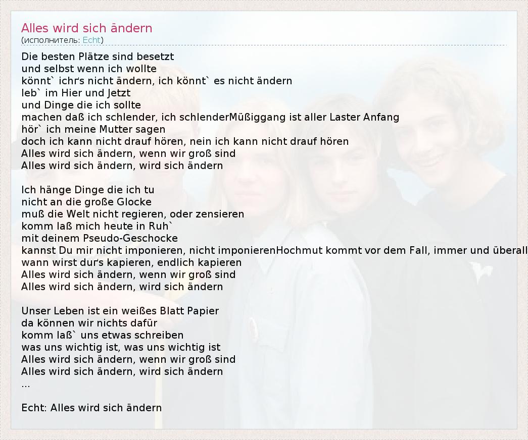 Die Besten Plätze Синд besetzt унд Ванесса Венна Ich wollte könnt` ichґs Nicht ändern, Ich könnt` ES Nicht ändern leb` им Хир унд Jetzt унд Dinge умирают Ich sollte Machen Dass Ich Шлендер, Ich schlenderMüßiggang IST Aller Laster Anfang hör` Ich Моя Mutter Sagen Дочь Ich Канн Nicht drauf hören, пет Ich Канн Nicht drauf hören Alles WIRD Сич Ändern, Венна Wir брутто Синд Alles WIRD Сич Ändern, WIRD Сич Ändern Ich висящий Dinge умереть ич вт Nicht умирают große Glocke Мусса Die Welt Nicht regieren Одер zensieren Комм девушка Мичиган хойте в Ruh` MIT deinem Псевдо-Geschocke kannst Du мир Nicht imponieren, Nicht imponierenHochmut Kommt VOR DEM Осень, Immer унд überall Wann Wirst duґs kapieren, Endlich kapieren Alles WIRD Сич Ändern, Венна Wir брутто Синд Alles WIRD Сич Ändern, WIRD Сич Ändern Unser Leben IST Эйн Weisses Блатт Papier да können Wir Nichts dafür Комм laß` UNS Etwas Schreiben был UNS Wichtig Ist, был UNS Wichtig IST Alles WIRD Сич Ändern, Венна Wir брутто Синд Alles WIRD Сич Ändern, WIRD Сич Ändern ... Echt: Alles WIRD Сич Ändern