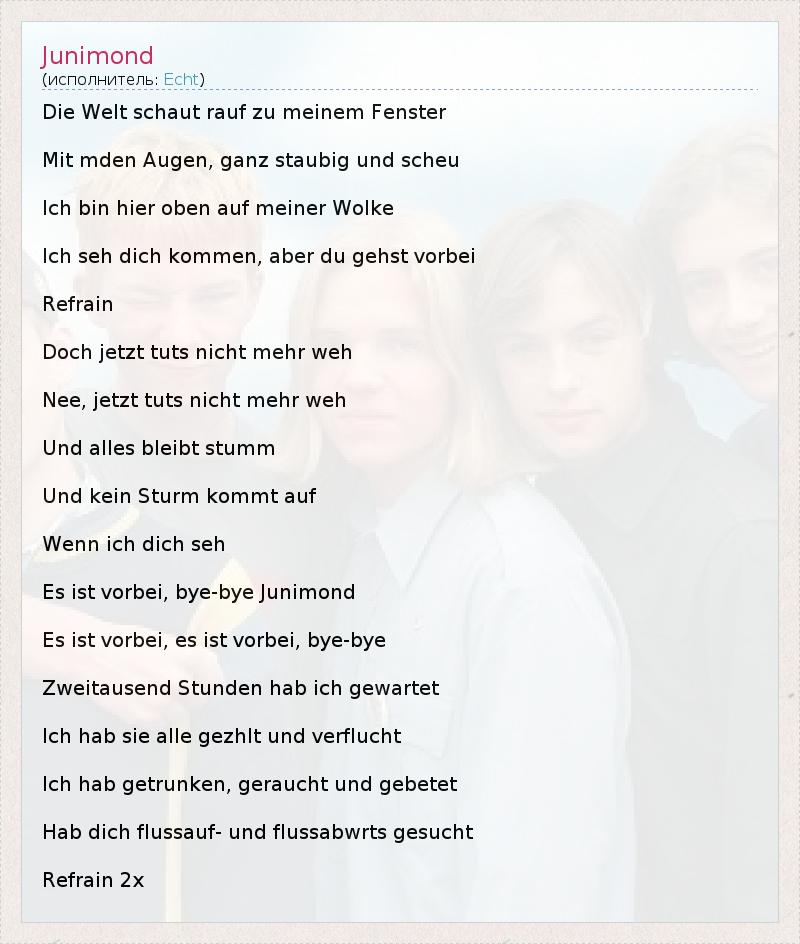 Die Welt schaut rauf zu meinem Fenster Mit mden Augen, ganz staubig und scheu Ich bin hier oben auf meiner Wolke Ich seh dich kommen, aber du gehst vorbei Refrain Doch jetzt tuts nicht mehr weh Nee, jetzt tuts nicht mehr weh Und alles bleibt stumm Und kein Sturm kommt auf Wenn ich dich seh Es ist vorbei, bye-bye Junimond Es ist vorbei, es ist vorbei, bye-bye Zweitausend Stunden hab ich gewartet Ich hab sie alle gezhlt und verflucht Ich hab getrunken, geraucht und gebetet Hab dich flussauf- und flussabwrts gesucht Refrain 2x