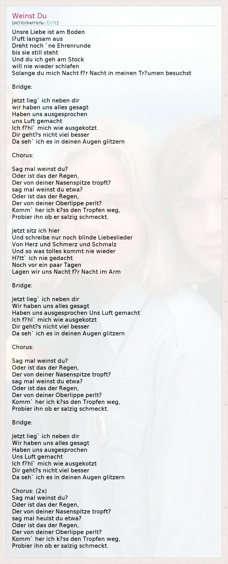 Unsre Liebe ist am Boden l?uft langsam aus Dreht noch `ne Ehrenrunde bis sie still steht Und du ich geh am Stock will nie wieder schlafen Solange du mich Nacht f?r Nacht in meinen Tr?umen besuchst Bridge: Jetzt lieg` ich neben dir wir haben uns alles gesagt Haben uns ausgesprochen uns Luft gemacht Ich f?hl` mich wie ausgekotzt Dir geht?s nicht viel besser Da seh` ich es in deinen Augen glitzern Chorus: Sag mal weinst du? Oder ist das der Regen, Der von deiner Nasenspitze tropft? sag mal weinst du etwa? Oder ist das der Regen, Der von deiner Oberlippe perlt? Komm` her ich k?ss den Tropfen weg, Probier ihn ob er salzig schmeckt. Jetzt sitz ich hier Und schreibe nur noch blinde Liebeslieder Von Herz und Schmerz und Schmalz Und so was tolles kommt nie wieder H?tt` ich nie gedacht Noch vor ein paar Tagen Lagen wir uns Nacht f?r Nacht im Arm Bridge: Jetzt lieg` ich neben dir Wir haben uns alles gesagt Haben uns ausgesprochen Uns Luft gemacht Ich f?hl` mich wie ausgekotzt Dir geht?s nicht viel besser Da seh` ich es in deinen Augen glitzern Chorus: Sag mal weinst du? Oder ist das der Regen, Der von deiner Nasenspitze tropft? sag mal weinst du etwa? Oder ist das der Regen, Der von deiner Oberlippe perlt? Komm` her ich k?ss den Tropfen weg, Probier ihn ob er salzig schmeckt. Bridge: Jetzt lieg` ich neben dir Wir haben uns alles gesagt Haben uns ausgesprochen Uns Luft gemacht Ich f?hl` mich wie ausgekotzt Dir geht?s nicht viel besser Da seh` ich es in deinen Augen glitzern Chorus: (2x) Sag mal weinst du? Oder ist das der Regen, Der von deiner Nasenspitze tropft? sag mal heulst du etwa? Oder ist das der Regen, Der von deiner Oberlippe perlt? Komm` her ich k?ss den Tropfen weg, Probier ihn ob er salzig schmeckt.