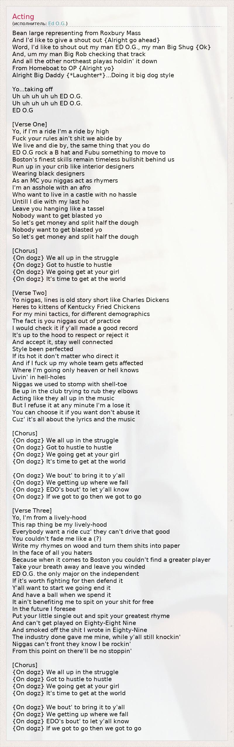 Это интересно:Edo G, также известный как Ed O.G. (рожденный Эдвард Anderson в 1971 г.), хип-хоп-артист из Бостона, шт. Массачусетс, США. В 1991 г. Ed O.G. выпускает очень неплохой альбом с его тогда-группой Da Bulldogs, названный "Life of a Kid in the Ghetto". В которой входили такие хиты, как "Be a Father to Your Child" и "I Got To Have It,", который был выбран позже Mary J. Blige в треке "Ooh!". Группа была критикована Mercury Records в 1993 г. С тех пор... продолжение