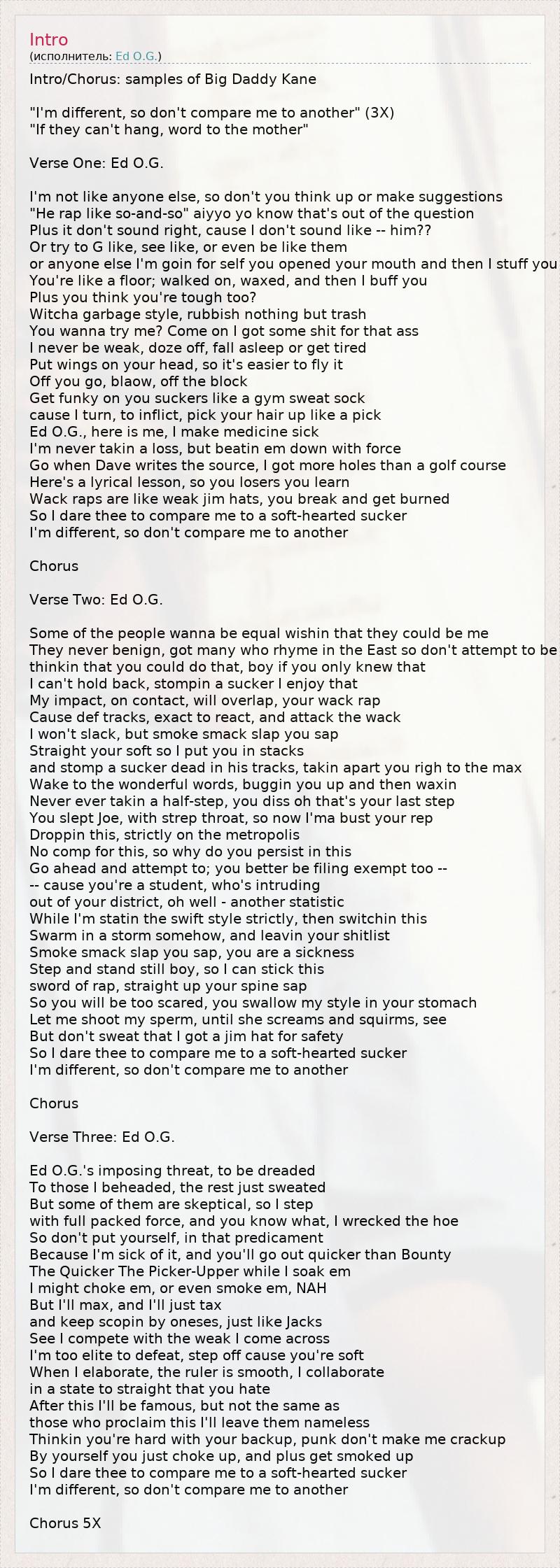 Это интересно:Edo G, также известный как Ed O.G. (рожденный Эдвард Anderson в 1971 г.), хип-хоп-артист из Бостона, шт. Массачусетс, США. В 1991 г. Ed O.G. выпускает очень неплохой альбом с его тогда-группой Da Bulldogs, названный "Life of a Kid in the Ghetto". В которой входили такие хиты, как "Be a Father to Your Child" и "I Got To Have It,", который был выбран позже Mary J. Blige в треке "Ooh!". Группа была критикована Mercury Records в 1993 г. С тех пор... продолжение