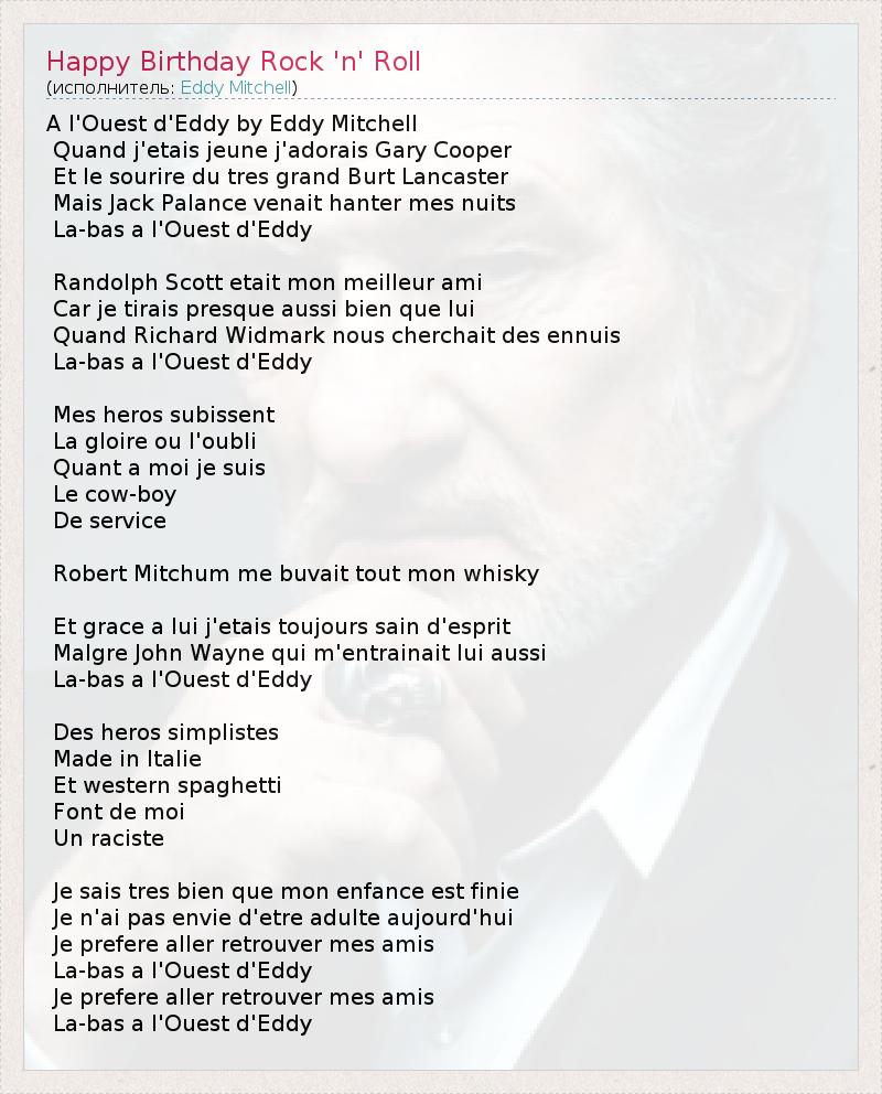 A l'Ouest d'Eddy by Eddy Mitchell Quand j'etais jeune j'adorais Gary Cooper Et le sourire du tres grand Burt Lancaster Mais Jack Palance venait hanter mes nuits La-bas a l'Ouest d'Eddy Randolph Scott etait mon meilleur ami Car je tirais presque aussi bien que lui Quand Richard Widmark nous cherchait des ennuis La-bas a l'Ouest d'Eddy Mes heros subissent La gloire ou l'oubli Quant a moi je suis Le cow-boy De service Robert Mitchum me buvait tout mon whisky Et grace a lui j'etais toujours sain d'esprit Malgre John Wayne qui m'entrainait lui aussi La-bas a l'Ouest d'Eddy Des heros simplistes Made in Italie Et western spaghetti Font de moi Un raciste Je sais tres bien que mon enfance est finie Je n'ai pas envie d'etre adulte aujourd'hui Je prefere aller retrouver mes amis La-bas a l'Ouest d'Eddy Je prefere aller retrouver mes amis La-bas a l'Ouest d'Eddy