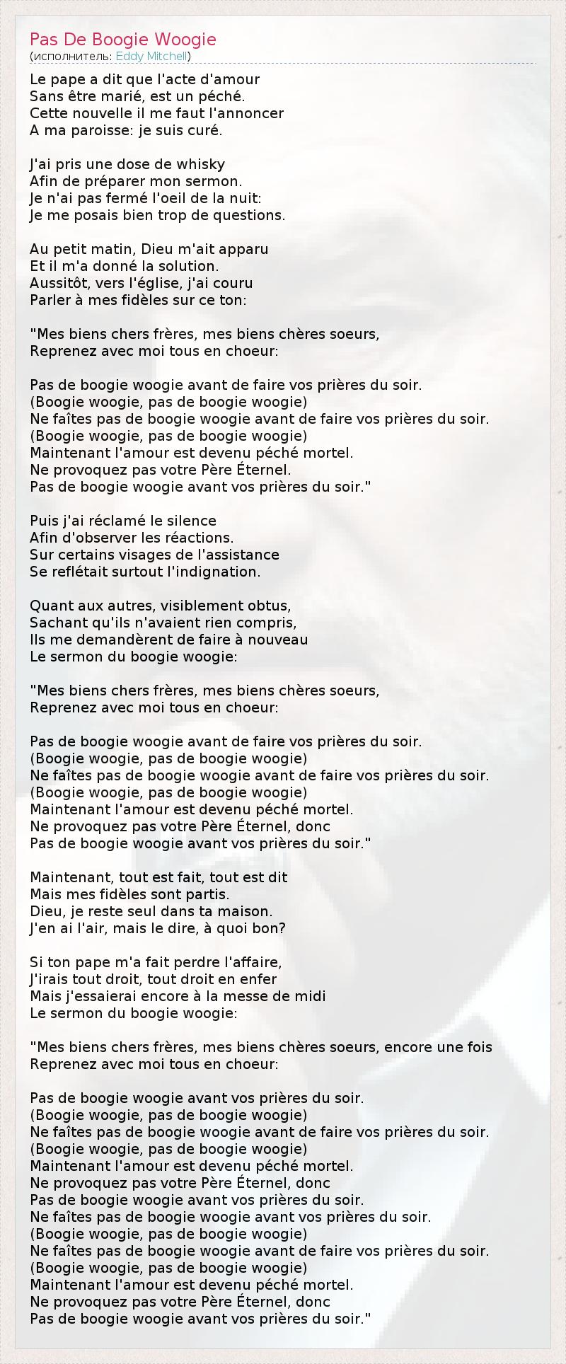 Le pape a dit que l'acte d'amour Sans être marié, est un péché. Cette nouvelle il me faut l'annoncer A ma paroisse: je suis curé. J'ai pris une dose de whisky Afin de préparer mon sermon. Je n'ai pas fermé l'oeil de la nuit: Je me posais bien trop de questions. Au petit matin, Dieu m'ait apparu Et il m'a donné la solution. Aussitôt, vers l'église, j'ai couru Parler à mes fidèles sur ce ton: "Mes biens chers frères, mes biens chères soeurs, Reprenez avec moi tous en choeur: Pas de boogie woogie avant de faire vos prières du soir. (Boogie woogie, pas de boogie woogie) Ne faîtes pas de boogie woogie avant de faire vos prières du soir. (Boogie woogie, pas de boogie woogie) Maintenant l'amour est devenu péché mortel. Ne provoquez pas votre Père Éternel. Pas de boogie woogie avant vos prières du soir." Puis j'ai réclamé le silence Afin d'observer les réactions. Sur certains visages de l'assistance Se reflétait surtout l'indignation. Quant aux autres, visiblement obtus, Sachant qu'ils n'avaient rien compris, Ils me demandèrent de faire à nouveau Le sermon du boogie woogie: "Mes biens chers frères, mes biens chères soeurs, Reprenez avec moi tous en choeur: Pas de boogie woogie avant de faire vos prières du soir. (Boogie woogie, pas de boogie woogie) Ne faîtes pas de boogie woogie avant de faire vos prières du soir. (Boogie woogie, pas de boogie woogie) Maintenant l'amour est devenu péché mortel. Ne provoquez pas votre Père Éternel, donc Pas de boogie woogie avant vos prières du soir." Maintenant, tout est fait, tout est dit Mais mes fidèles sont partis. Dieu, je reste seul dans ta maison. J'en ai l'air, mais le dire, à quoi bon? Si ton pape m'a fait perdre l'affaire, J'irais tout droit, tout droit en enfer Mais j'essaierai encore à la messe de midi Le sermon du boogie woogie: "Mes biens chers frères, mes biens chères soeurs, encore une fois Reprenez avec moi tous en choeur: Pas de boogie woogie avant vos prières du soir. (Boogie woogie, pas de boogie woogie) Ne faîtes pas de boogie woogie avant de faire vos prières du soir. (Boogie woogie, pas de boogie woogie) Maintenant l'amour est devenu péché mortel. Ne provoquez pas votre Père Éternel, donc Pas de boogie woogie avant vos prières du soir. Ne faîtes pas de boogie woogie avant vos prières du soir. (Boogie woogie, pas de boogie woogie) Ne faîtes pas de boogie woogie avant de faire vos prières du soir. (Boogie woogie, pas de boogie woogie) Maintenant l'amour est devenu péché mortel. Ne provoquez pas votre Père Éternel, donc Pas de boogie woogie avant vos prières du soir."