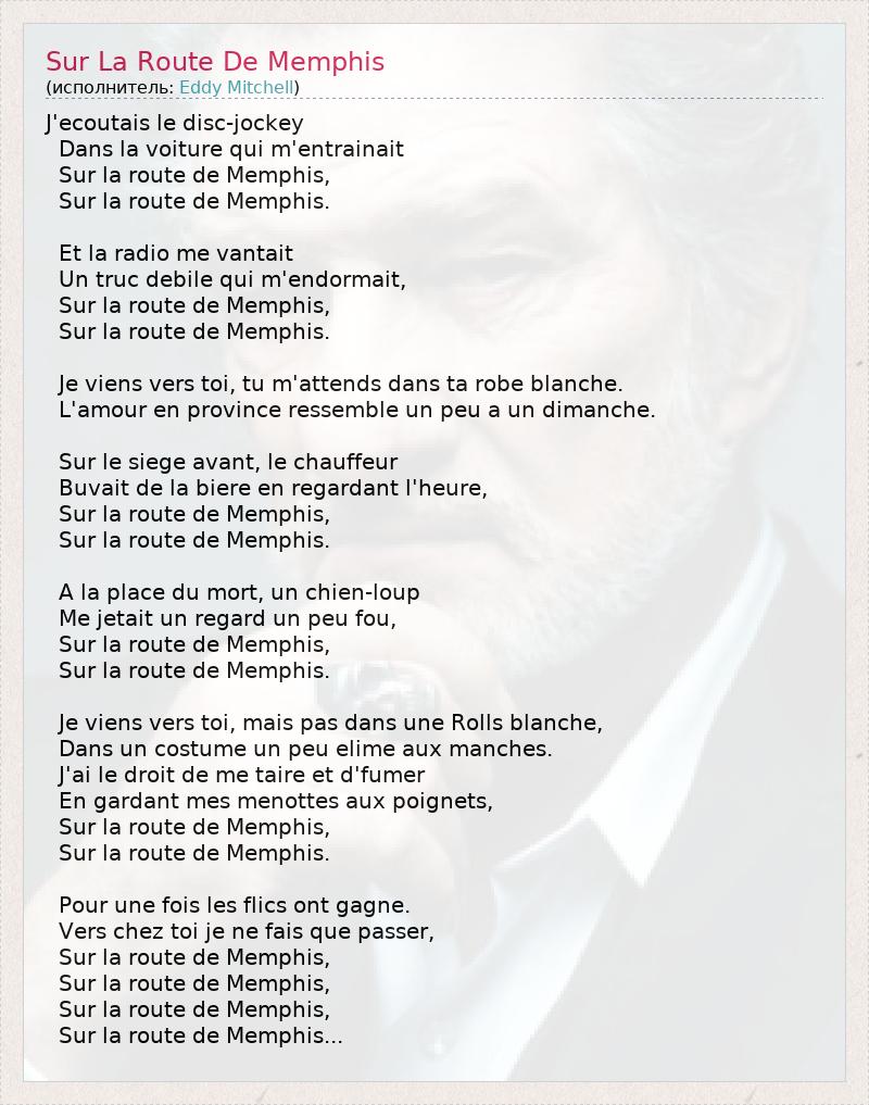 J'ecoutais le disc-jockey Dans la voiture qui m'entrainait Sur la route de Memphis, Sur la route de Memphis. Et la radio me vantait Un truc debile qui m'endormait, Sur la route de Memphis, Sur la route de Memphis. Je viens vers toi, tu m'attends dans ta robe blanche. L'amour en province ressemble un peu a un dimanche. Sur le siege avant, le chauffeur Buvait de la biere en regardant l'heure, Sur la route de Memphis, Sur la route de Memphis. A la place du mort, un chien-loup Me jetait un regard un peu fou, Sur la route de Memphis, Sur la route de Memphis. Je viens vers toi, mais pas dans une Rolls blanche, Dans un costume un peu elime aux manches. J'ai le droit de me taire et d'fumer En gardant mes menottes aux poignets, Sur la route de Memphis, Sur la route de Memphis. Pour une fois les flics ont gagne. Vers chez toi je ne fais que passer, Sur la route de Memphis, Sur la route de Memphis, Sur la route de Memphis, Sur la route de Memphis...