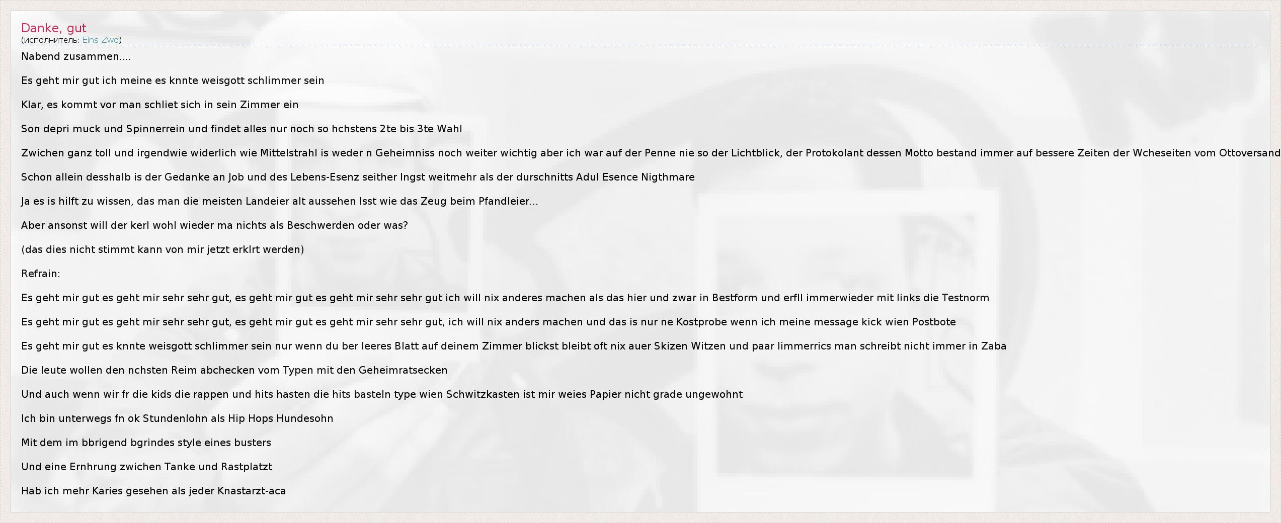 Es geht mir gut es geht mir sehr sehr gut, es geht mir gut es geht mir sehr sehr gut ich will nix anderes machen als das hier und zwar in Bestform und erfll immerwieder mit links die Testnorm