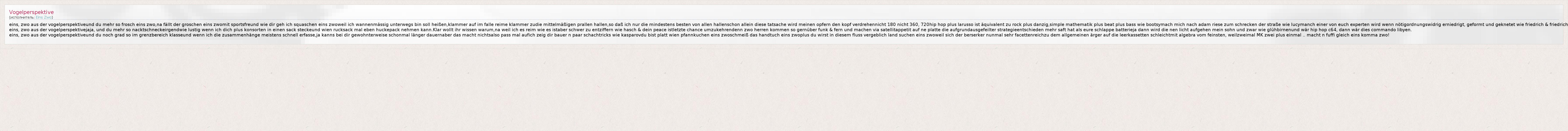 eins, zwo aus der vogelperspektiveund du mehr so frosch eins zwo,na fällt der groschen eins zwomit sportsfreund wie dir geh ich squaschen eins zwoweil ich wannenmässig unterwegs bin soll heißen,klammer auf im falle reime klammer zudie mittelmäßigen prallen hallen,so daß ich nur die mindestens besten von allen hallenschon allein diese tatsache wird meinen opfern den kopf verdrehennicht 180 nicht 360, 720hip hop plus larusso ist äquivalent zu rock plus danzig,simple mathematik plus beat plus bass wie bootsymach mich nach adam riese zum schrecken der straße wie lucymanch einer von euch experten wird wenn nötigordnungswidrig erniedrigt, geformt und geknetet wie friedrich & friedrich eins, zwo aus der vogelperspektivejaja, und du mehr so nacktschneckeirgendwie lustig wenn ich dich plus konsorten in einen sack steckeund wien rucksack mal eben huckepack nehmen kann.Klar wollt ihr wissen warum,na weil ich es reim wie es istaber schwer zu entziffern wie hasch & dein peace istletzte chance umzukehrendenn zwo herren kommen so gernüber funk & fern und machen via satellitappetit auf ne platte die aufgrundausgefeilter strategieentschieden mehr saft hat als eure schlappe batterieja dann wird die nen licht aufgehen mein sohn und zwar wie glühbirnenund wär hip hop c64, dann wär dies commando libyen. eins, zwo aus der vogelperspektiveund du noch grad so im grenzbereich klasseund wenn ich die zusammenhänge meistens schnell erfasse,ja kanns bei dir gewohnterweise schonmal länger dauernaber das macht nichtsalso pass mal aufich zeig dir bauer n paar schachtricks wie kasparovdu bist platt wien pfannkuchen eins zwoschmeiß das handtuch eins zwoplus du wirst in diesem fluss vergeblich land suchen eins zwoweil sich der berserker nunmal sehr facettenreichzu dem allgemeinen ärger auf die leerkassetten schleichtmit algebra vom feinsten, weilzweimal MK zwei plus einmal .. macht n fuffi gleich eins komma zwo!