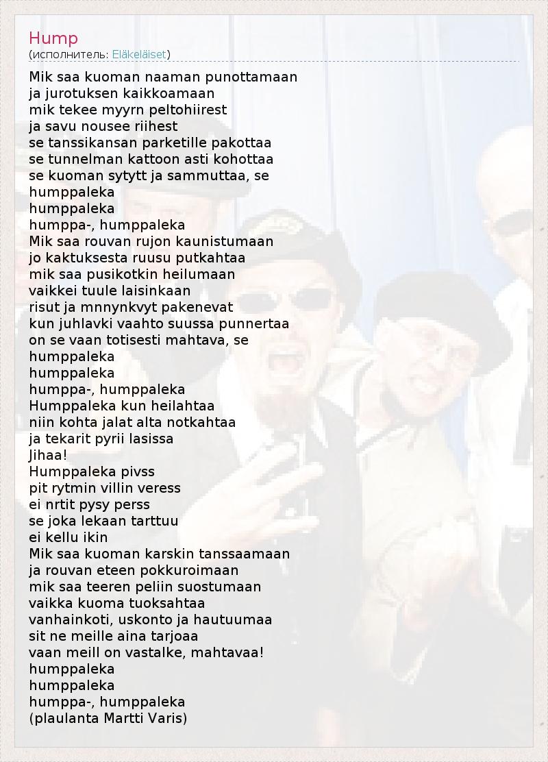 Mik saa kuoman naaman punottamaan ja jurotuksen kaikkoamaan mik tekee myyrn peltohiirest ja savu nousee riihest se tanssikansan parketille pakottaa se tunnelman kattoon asti kohottaa se kuoman sytytt ja sammuttaa, se humppaleka humppaleka humppa-, humppaleka Mik saa rouvan rujon kaunistumaan jo kaktuksesta ruusu putkahtaa mik saa pusikotkin heilumaan vaikkei tuule laisinkaan risut ja mnnynkvyt pakenevat kun juhlavki vaahto suussa punnertaa on se vaan totisesti mahtava, se humppaleka humppaleka humppa-, humppaleka Humppaleka kun heilahtaa niin kohta jalat alta notkahtaa ja tekarit pyrii lasissa Jihaa! Humppaleka pivss pit rytmin villin veress ei nrtit pysy perss se joka lekaan tarttuu ei kellu ikin Mik saa kuoman karskin tanssaamaan ja rouvan eteen pokkuroimaan mik saa teeren peliin suostumaan vaikka kuoma tuoksahtaa vanhainkoti, uskonto ja hautuumaa sit ne meille aina tarjoaa vaan meill on vastalke, mahtavaa! humppaleka humppaleka humppa-, humppaleka (plaulanta Martti Varis)